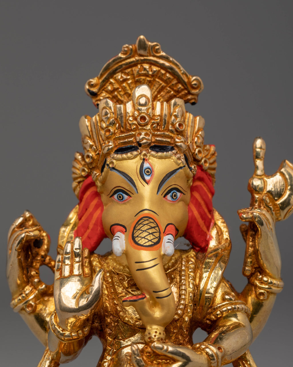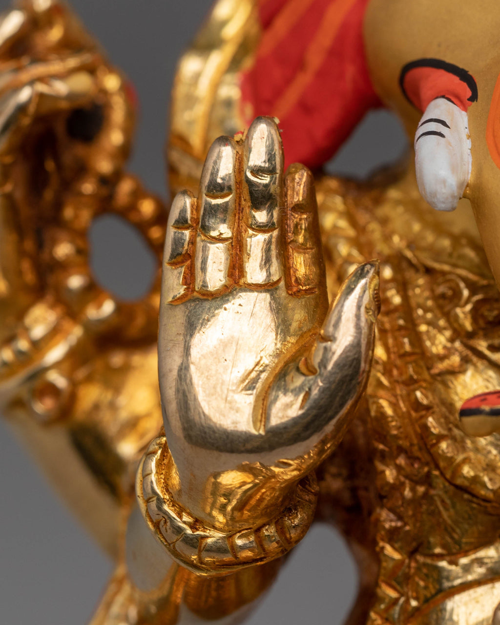 The intricate design and gold-plated detailing bring a sense of grandeur and sanctity to the statue. The vivid acrylic colors accentuate Lord Ganesha's facial features, making the statue a striking focal point in any spiritual space. His calm and benevolent expression embodies peace, while his raised hand in blessing signifies protection and divine grace. This statue is perfect for altars, meditation spaces, or as an auspicious gift to invoke blessings of success, abundance, and knowledge.