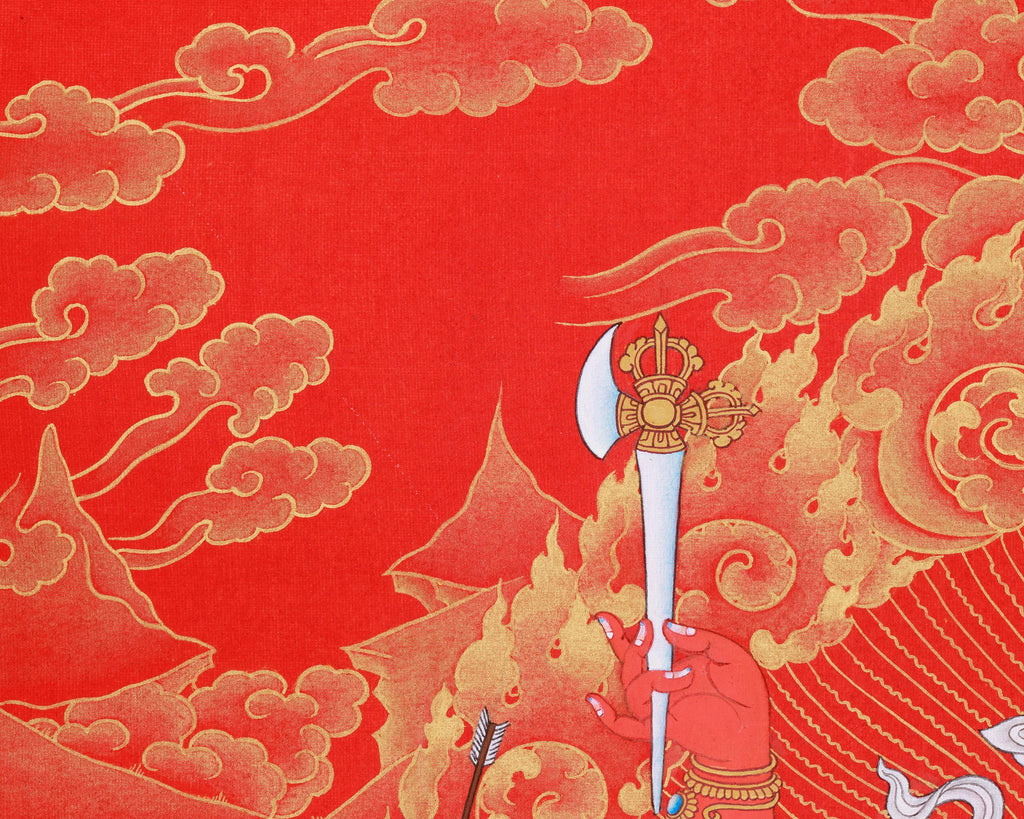 This thangka portrays Lord Ganesha, the deity associated with wisdom, prosperity, and new beginnings. Displayed in his luminous red form, he stands gracefully in a lively dance pose atop an eight-petalled lotus seat. He has multiple arms, each holding symbolic tools—axe, vajra, sword, hook, arrow, and spear—signifying his power to remove ignorance and lead devotees toward enlightenment. His calm yet commanding expression reflects a perfect balance—joyful compassion combined with strength. Ganesha’s large belly indicates his capacity to peacefully digest all life experiences—both good and bad—while his mongoose, shown below, expels jewels that symbolize boundless generosity. The golden backdrop, adorned with clouds and celestial motifs, elevates the divine beauty of this sacred piece, serving as a visual tribute to abundance, protection, and wisdom.