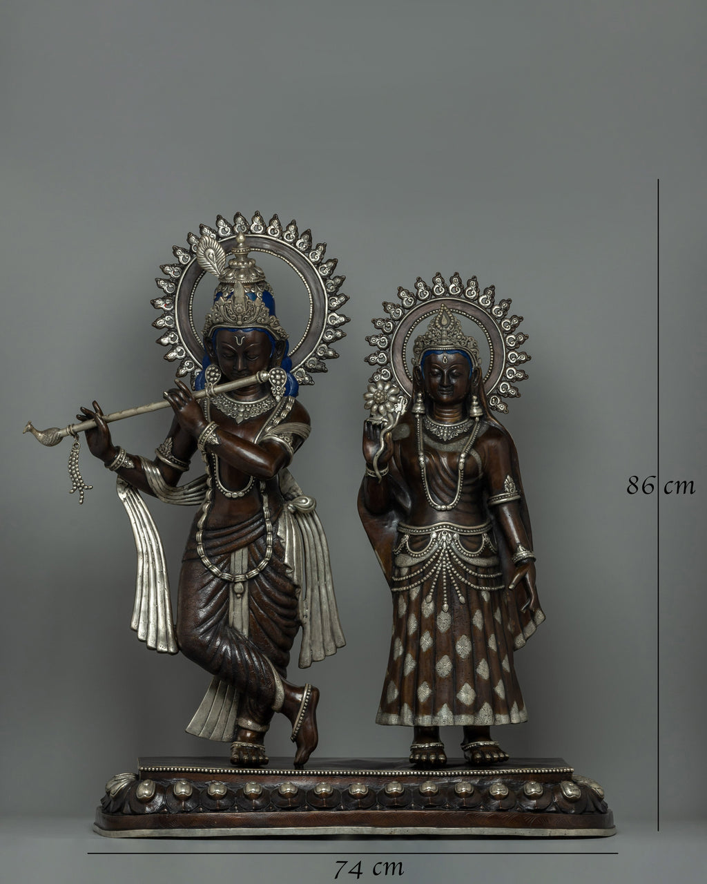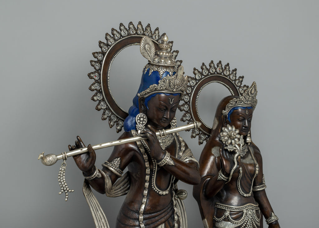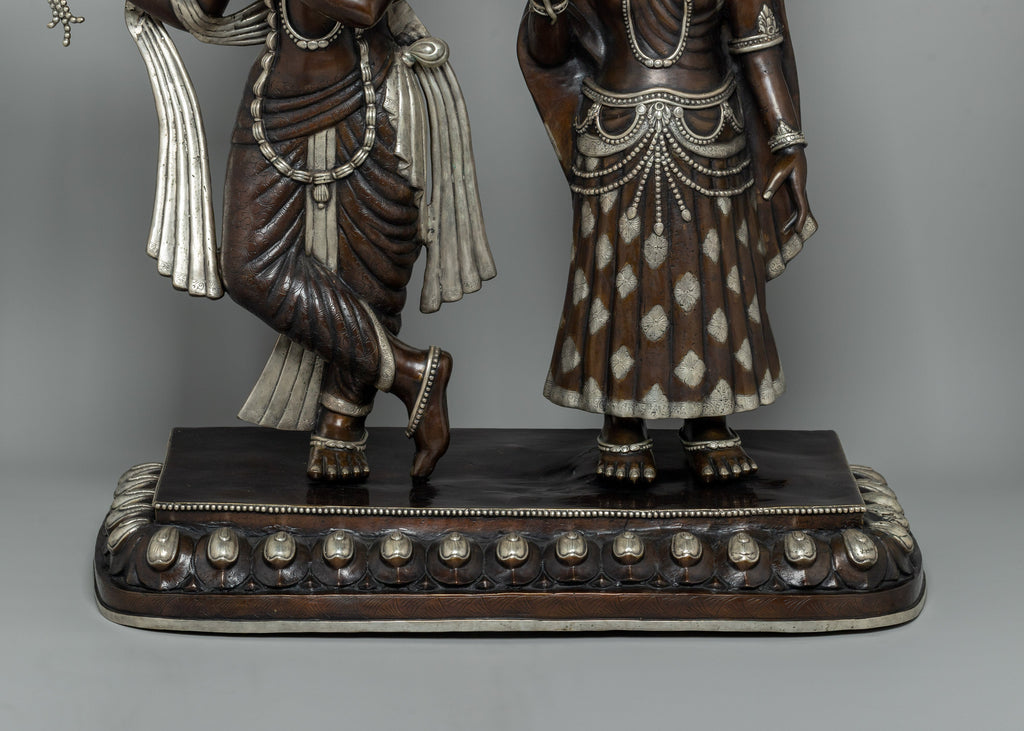 The statue of Lord Krishna and Radha is a stunning piece of art made of oxidized copper with silver plating that exudes elegance and heavenly appeal. The statue is 86 cm tall and has elaborate craftsmanship with a focus on minute details. The figurines stand smoothly on a wonderfully designed rectangular base embellished with circular and embossed decorations. This foundation not only offers structural support but also adds to the overall beauty of the item.