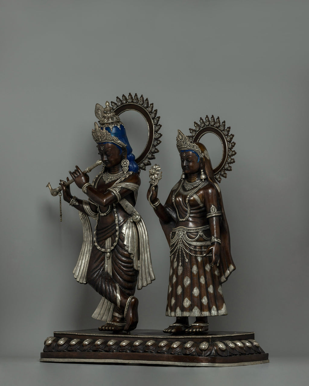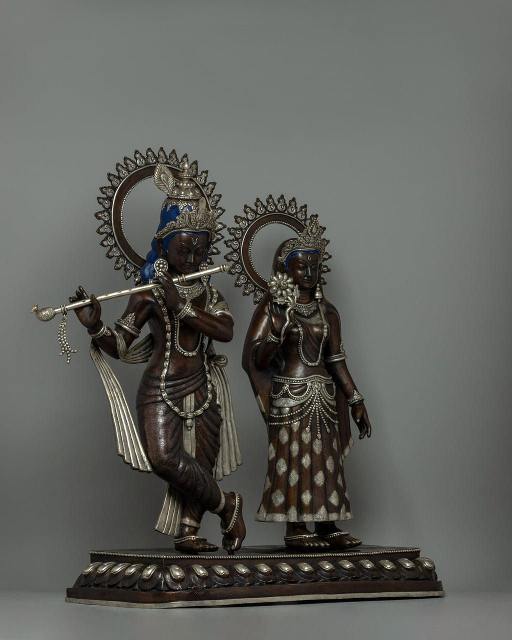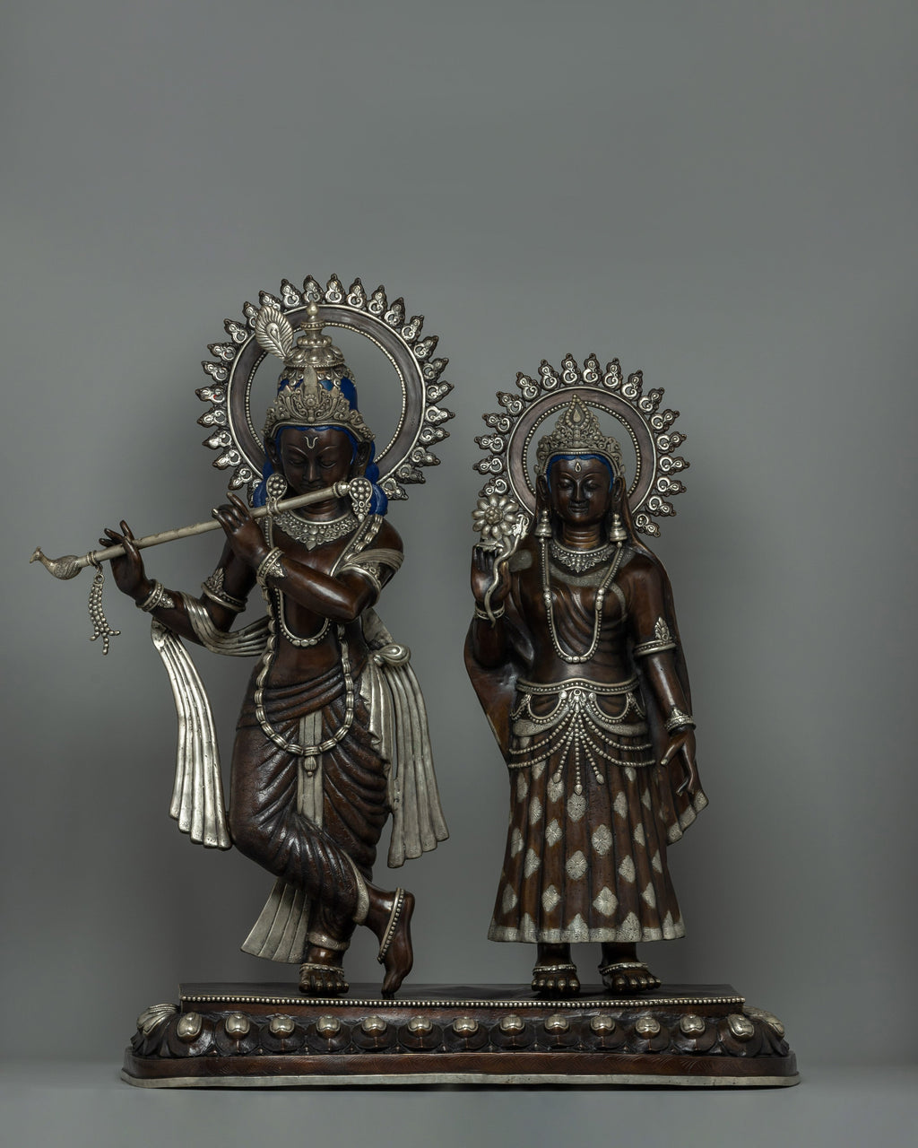 The statue of Lord Krishna and Radha is a stunning piece of art made of oxidized copper with silver plating that exudes elegance and heavenly appeal. The statue is 86 cm tall and has elaborate craftsmanship with a focus on minute details. The figurines stand smoothly on a wonderfully designed rectangular base embellished with circular and embossed decorations. This foundation not only offers structural support but also adds to the overall beauty of the item.