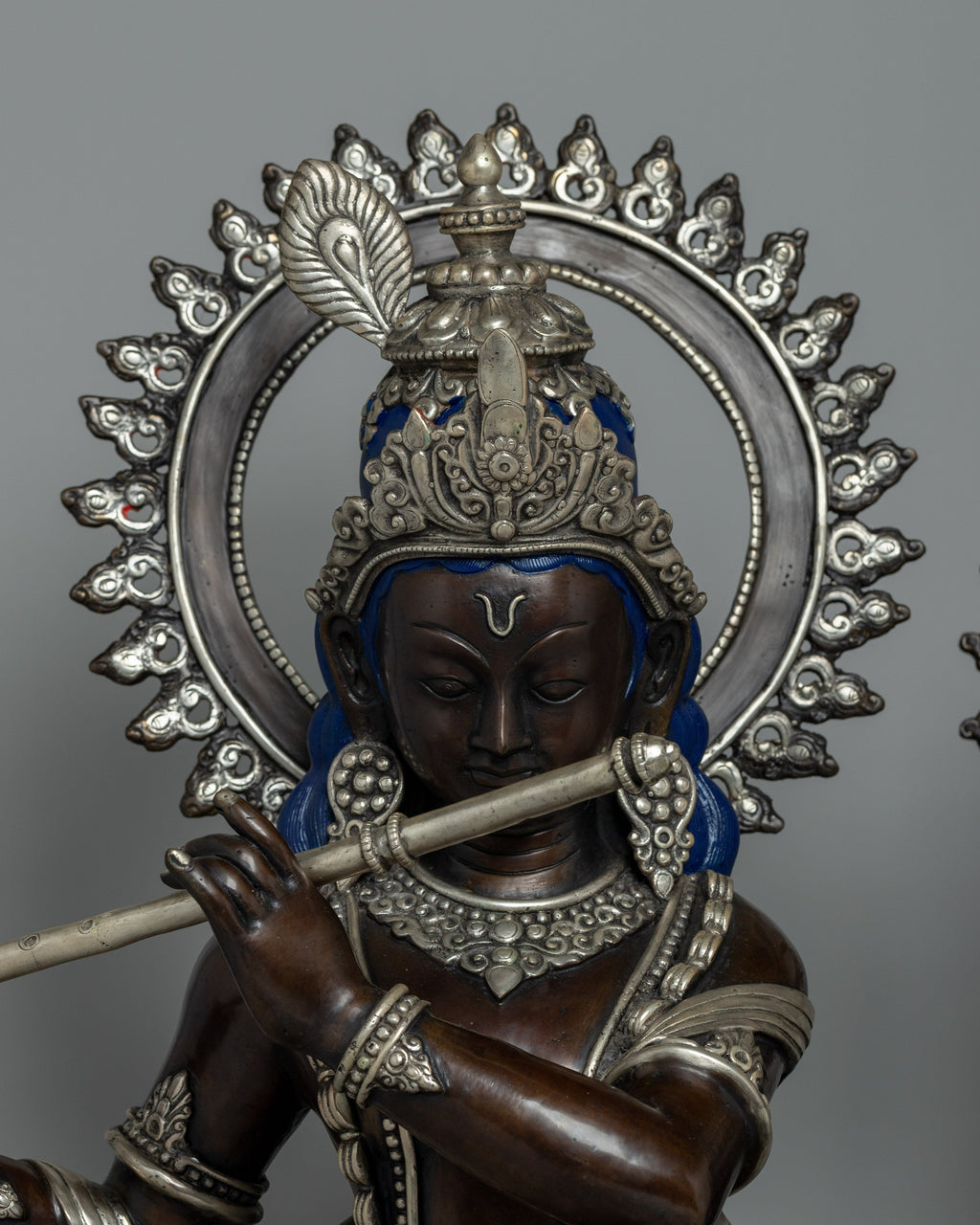 Lord Krishna is seen in a dynamic position, playing the flute with a tranquil look that conveys peace and holiness. His clothing flows freely, with intricate textures and delicate folds. The silver-plated ribbon draped about Krishna offers a brilliant touch, which is enhanced by delicate jewelry such as armlets, bracelets, and a perfectly designed crown. The halo behind Krishna's head, which has symmetrical radiating patterns, represents his holy radiance and presence.