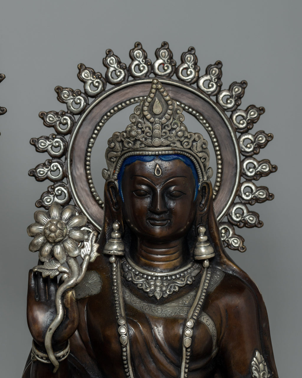 Radha stands gently behind Krishna, clutching a lotus flower, which symbolizes purity and devotion. Her outfit is similarly stunning, with an exquisitely crafted skirt with diamond-shaped motifs. Her elegance is enhanced by the bright halo behind her head, which she wears alongside necklaces, bangles, and a dainty crown. Krishna and Radha signify eternal love and devotion, making this a very exceptional monument worthy of praise.