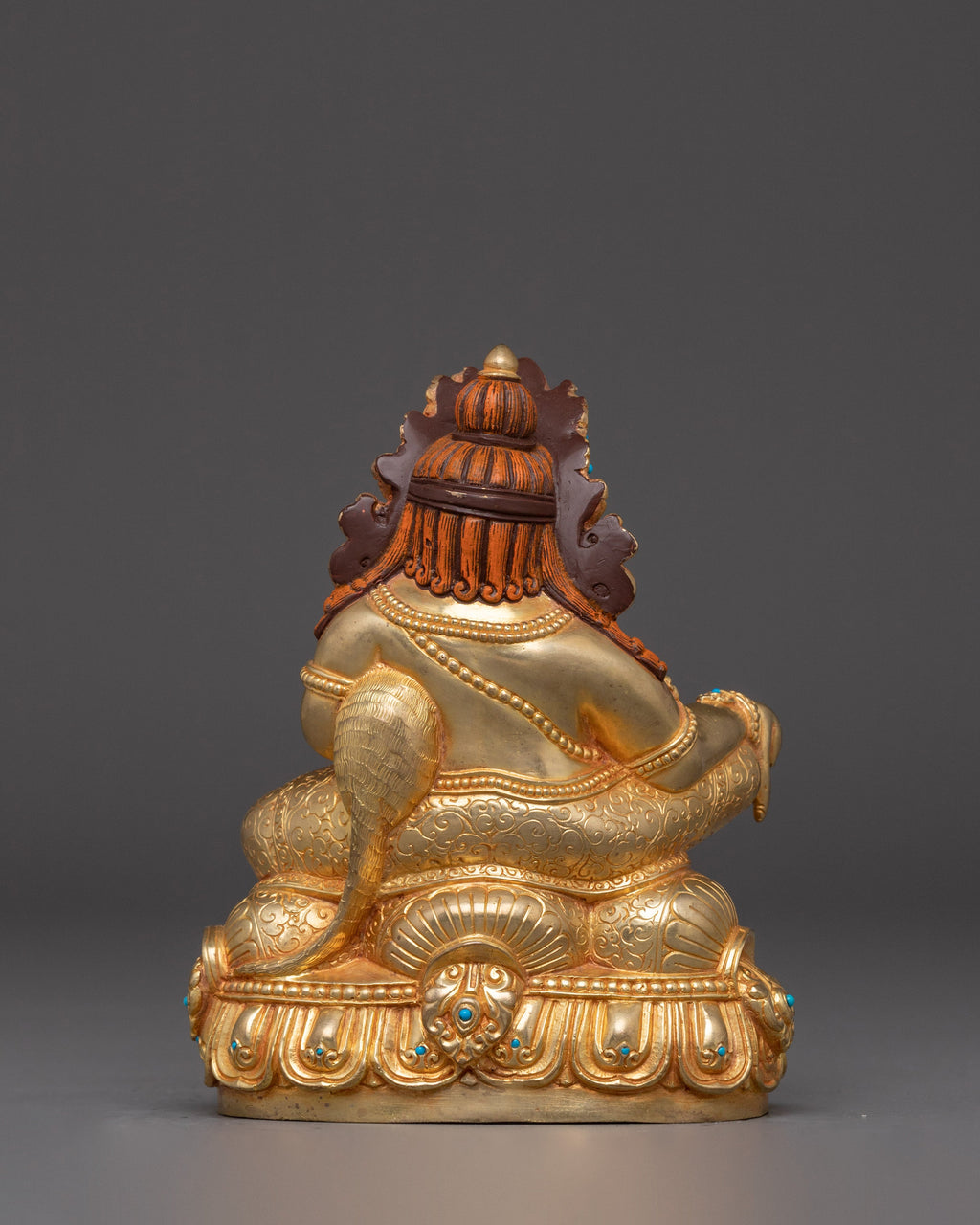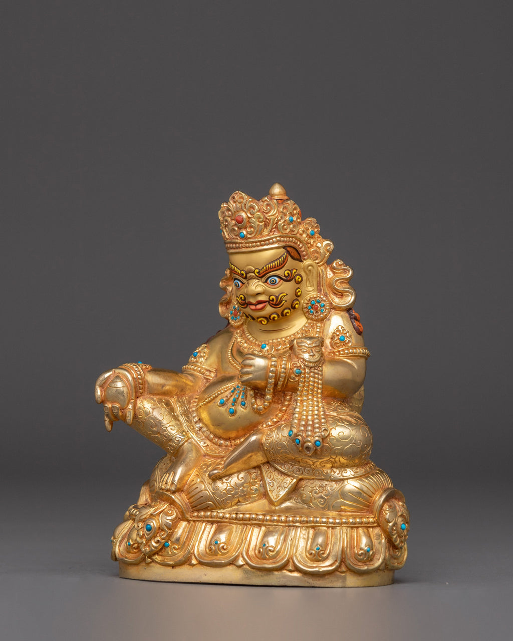 Dzambhala, the revered Buddhist deity of wealth, is known for eliminating poverty and misfortune while bringing prosperity and abundance to his devotees. In his iconography, he holds a mongoose in his left hand, which releases jewels, symbolizing unlimited wealth and material blessings. He has a citron fruit in his right hand, representing fulfillment, prosperity, and spiritual well-being. Seated in a regal posture on a lotus and moon disc, Dzambhala exudes a serene yet authoritative presence, with a face reflecting the dignity and power of a king. He is adorned with gemstones and ornaments, signifying his mastery over wealth and material abundance, while embodying compassion and his profound ability to influence fortune and spiritual prosperity.