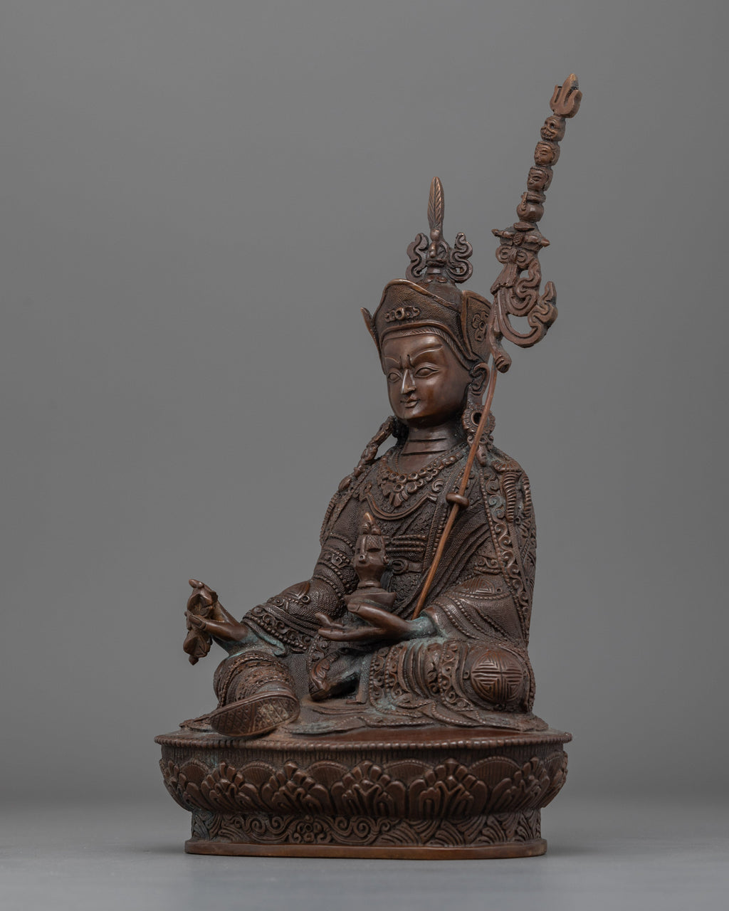 The statue is made of an oxidized copper body that helps prevent corrosion and preserve the underlying copper structure. Padmasambhava is depicted seated on a lotus throne, holding a vajra in his right hand and a skull cup carrying the nectar of wisdom immortality in his left hand. A "khatvanga" (sacred trident) with three severed heads leans on his left shoulder, symbolizing freedom from the three principal causes of misery (kayas). His robes are wonderfully molded with exquisite decors, and his unique cap is topped with an eagle feather on top.