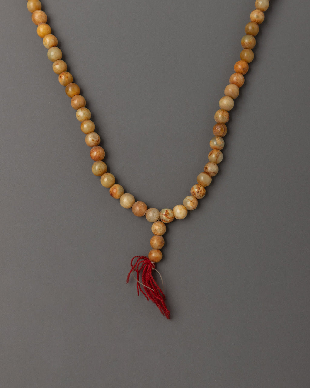 This mala of lotus seed beads is designed to enhance your meditation, japa, and spiritual activities. This mala is 57 cm long and has 108 9mm beads strung with a traditional red knot and tassel. Weighing 0.58 kg provides a grounded and balanced feel in your palms during sacred sessions. The lotus seed is revered for purity and symbolizes spiritual progress, making this mala an ideal companion for your inner journey.