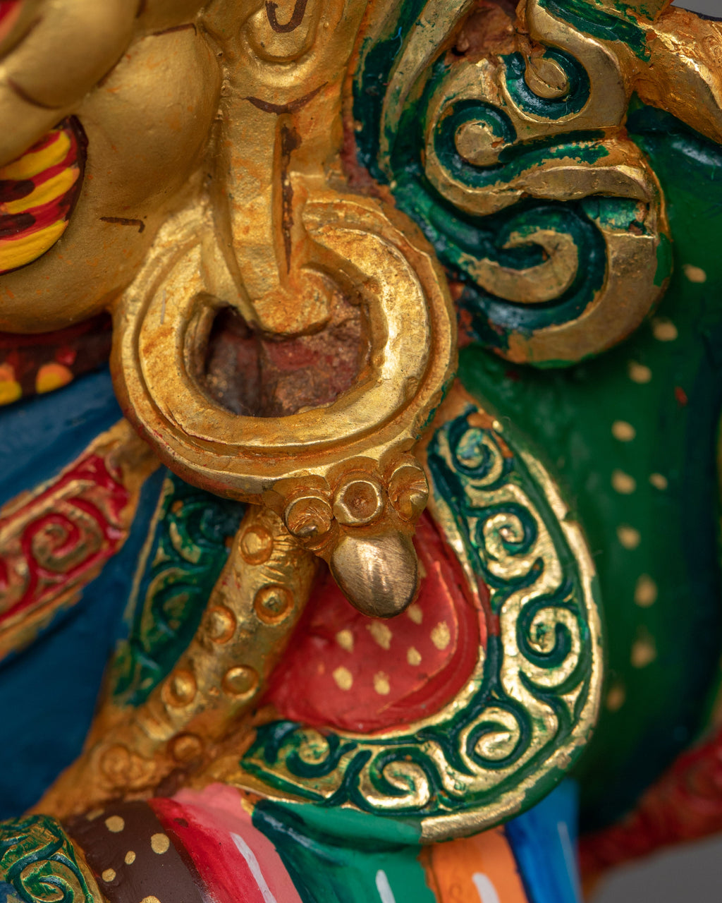 Mahakala Bernagchen is represented in his wrathful form, with a ferocious look and dynamic stance that represent his dedication to preserving the Dharma and removing impediments for practitioners. He has a kartika (ritual knife) in one hand and a kapala (skull cup) in the other, symbolizing his power to cut through delusion and ego. His ornate armor and intricate garments, embellished with gold and gemstones, reflect his regal and strong personality. This statue is an effective spiritual aid for individuals seeking protection, direction, and the elimination of harmful energy.