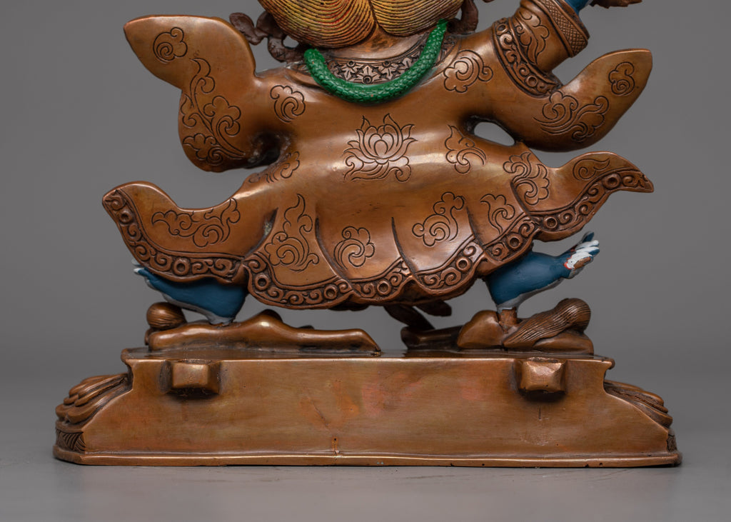 Mahakala Bernagchen is represented in his wrathful form, with a ferocious look and dynamic stance that represent his dedication to preserving the Dharma and removing impediments for practitioners. He has a kartika (ritual knife) in one hand and a kapala (skull cup) in the other, symbolizing his power to cut through delusion and ego. His ornate armor and intricate garments, embellished with gold and gemstones, reflect his regal and strong personality. This statue is an effective spiritual aid for individuals seeking protection, direction, and the elimination of harmful energy.