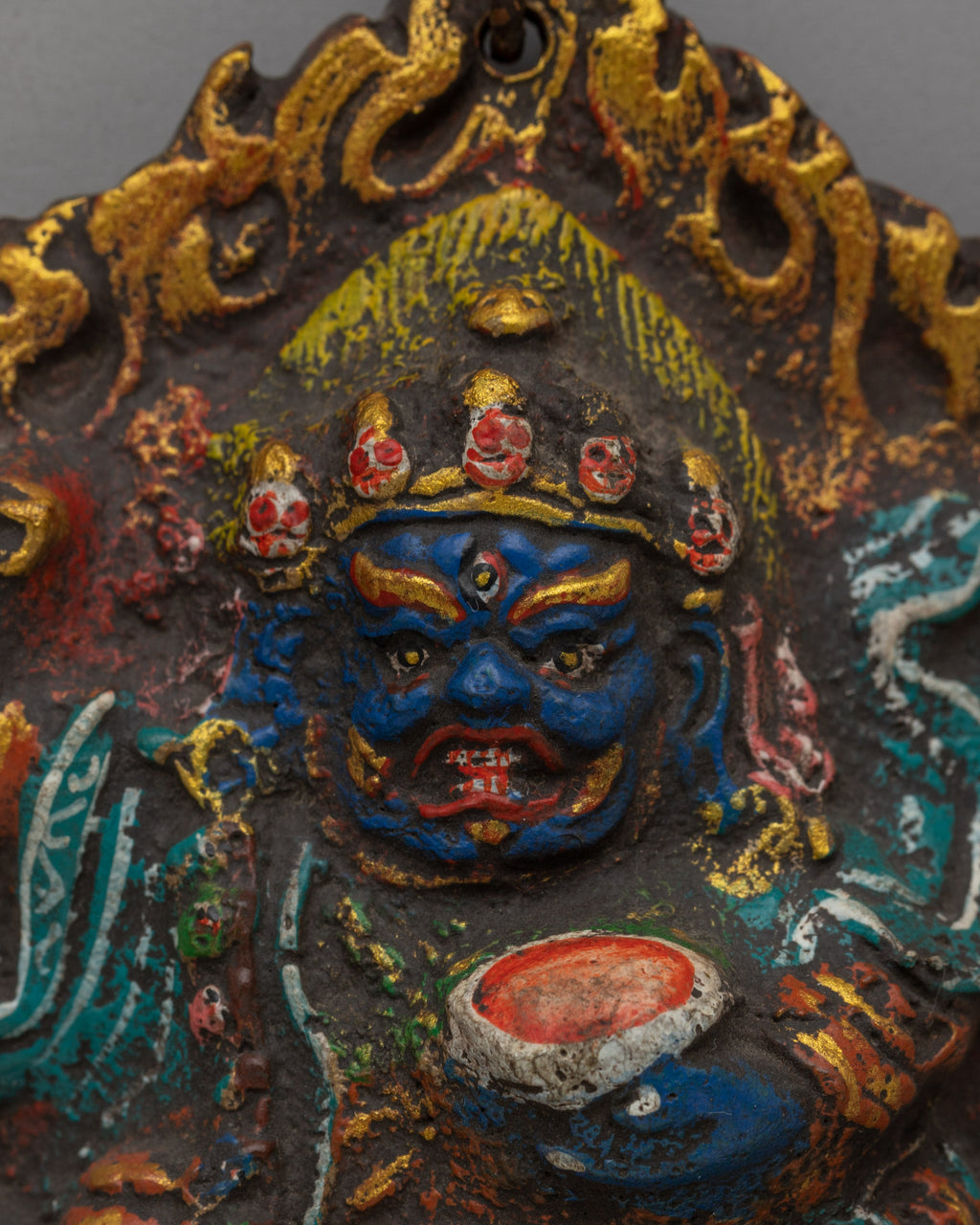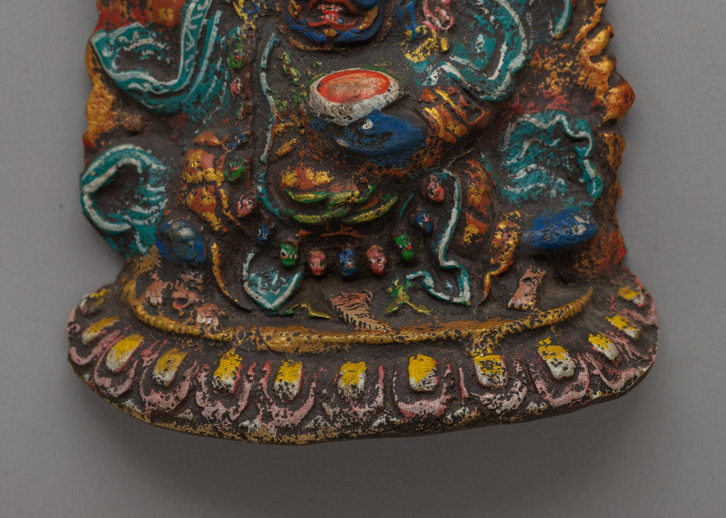 The Mahakala Bernakchen Locket is a striking, detailed brass wall adorned with vibrant acrylic colors. The figure of Mahakala, known for his wrathful and protective nature, is depicted in a dynamic and colorful design. The figure has his arms, one of which holds a ritual vessel (which can be interpreted as a symbol of wealth or offerings). His fierce expression is highlighted by the sharpness of his eyes, with his face showing power and protection. He is surrounded by flames, a common symbol in Mahakala imagery representing the burning away of ignorance.