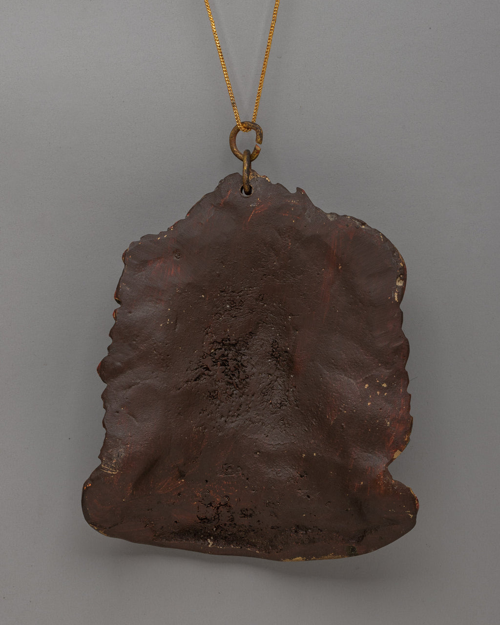 The use of acrylic color enhances the visual impact of this wall hanging, with rich blues and reds drawing attention to Mahakala's face and attire. At the same time, golden accents on the flames add an elegant contrast. The locket’s compact size—13cm in height and 10cm in width—makes it a striking piece that can easily be placed in a home or spiritual setting.