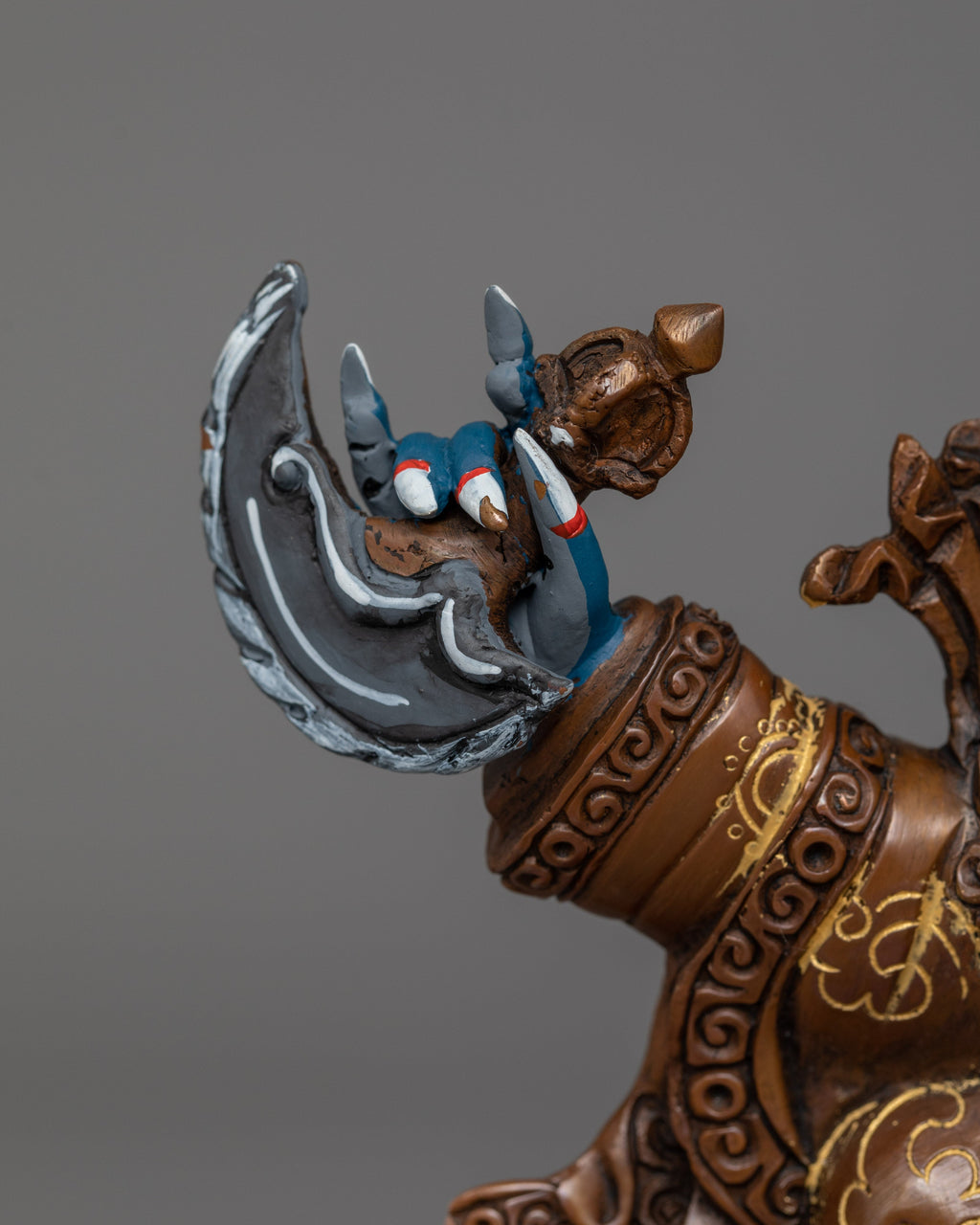 Mahakala Bernagchen is represented in his customary wrathful form, with a ferocious look and dynamic stance that represent his dedication to preserving the Dharma and removing impediments for practitioners. He has a kartika (ritual knife) in one hand and a kapala (skull cup) in the other, symbolizing his power to cut through delusion and ego. His ornate armor and intricate garments, embellished with gold and gemstones, reflect his regal and strong personality. This statue is an effective spiritual aid for individuals seeking protection, direction, and the elimination of harmful energy.