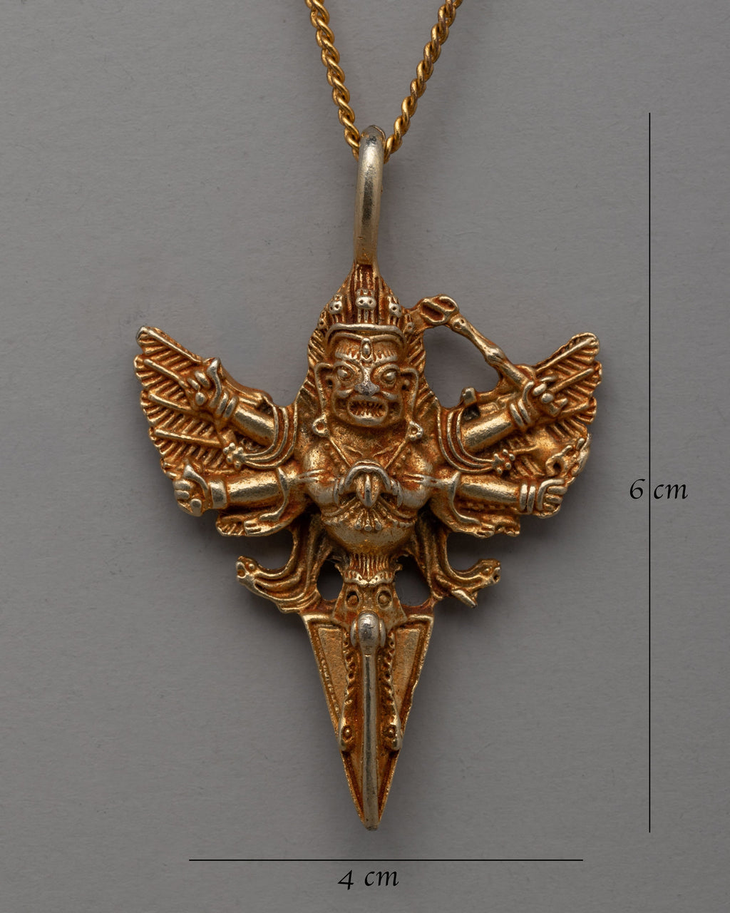 The Mahakala Phurba Locket, which is handcrafted from a copper body and electro-plated for a dazzling finish, is a magnificent expression of Buddhist spirituality. This elaborate pendant, which measures 6 cm in height and 4 cm in width, is adorned with the strong deity Mahakala, who is revered as the guardian and remover of spiritual barriers. This necklace, which incorporates the core of Buddhist teachings, is a genuine emblem of protection and meditation that serves as a daily reminder of awareness and spiritual development.