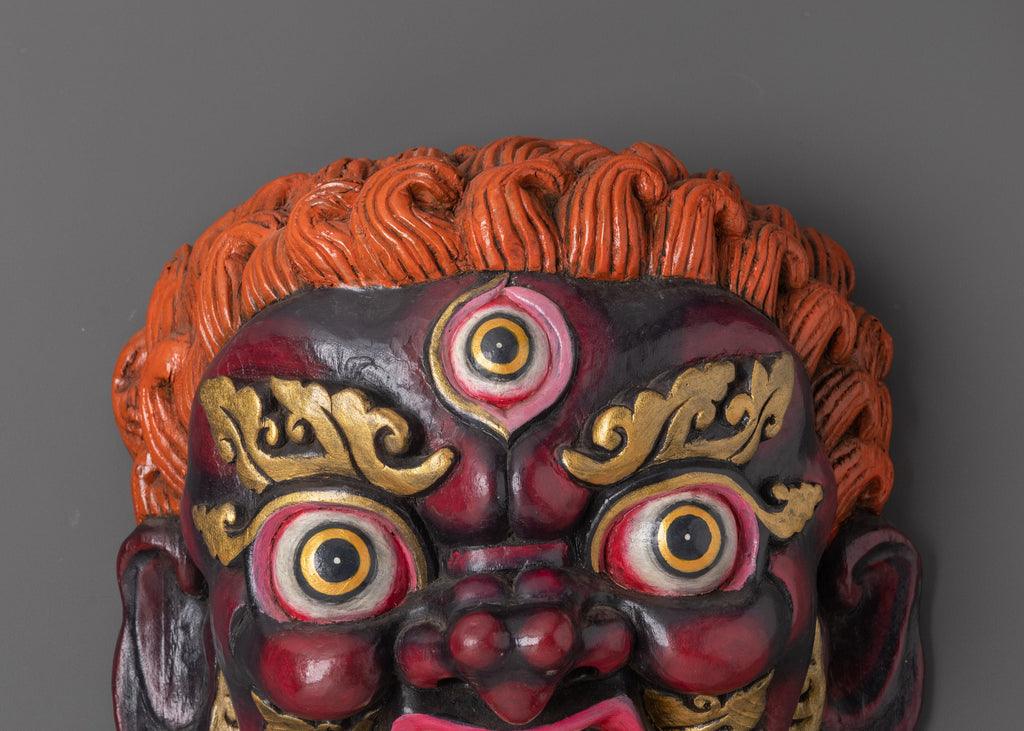 This wall hanging is made of wood and painted with acrylic colors. It displays intricate artistry in red and black tones, golden ornaments, and expressive characteristics that exude strength. The mask is capped with fiery hair and embellished with symbolic designs, symbolizing the cultural richness and spiritual meaning of Tibetan handicraft. Every brushstroke and carving detail reflects love and reverence for this wrathful yet loving divinity.