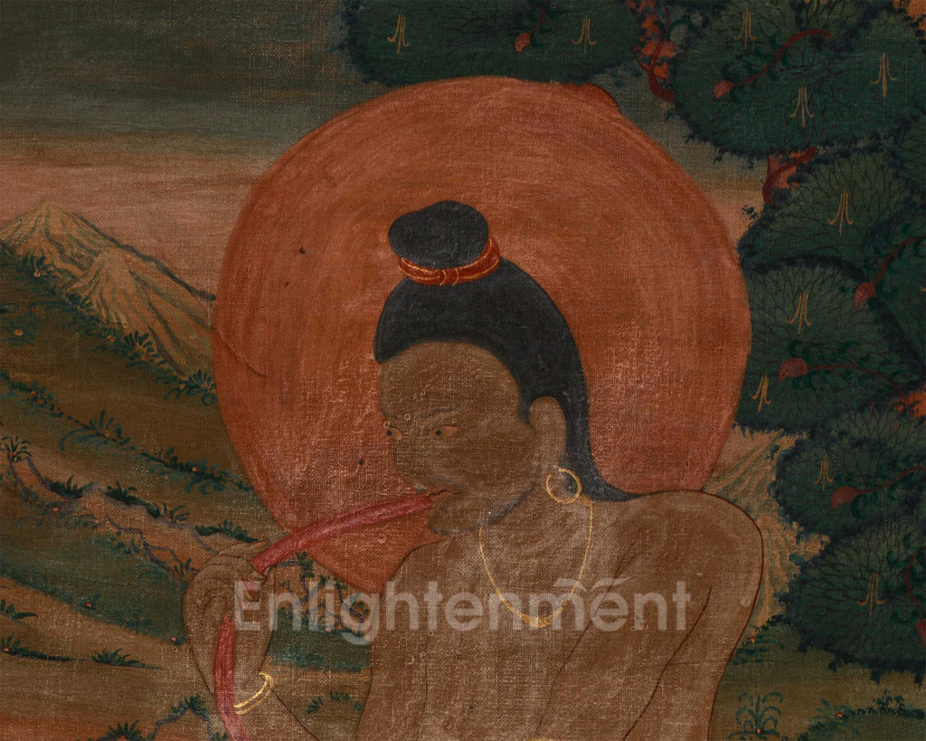 With its vintage appearance, this thangka holds immense historical importance, connecting contemporary audiences to the ancient traditions surrounding Mahasiddha figures in Vajrayana Buddhism. It intertwines the spiritual and historical stories of Buddhism, preserving them in a way that is both engaging and accessible for practitioners and scholars. As a remarkable example of Buddhist art, this thangka combines deep spiritual symbolism with exceptional artistic skill, making it a cherished item for spiritual seekers and collectors of religious art.