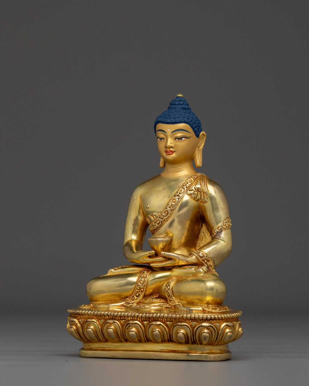 Amitabha is shown in a tranquil sitting stance, holding an alms bowl in his lap to symbolize renunciation and the simplicity of the enlightened life. His peaceful countenance represents the knowledge and compassion he bestows on individuals seeking rebirth in his Pure Land. Amitabha's dedication to assisting all creatures in achieving spiritual awareness and freedom is demonstrated by this gesture.