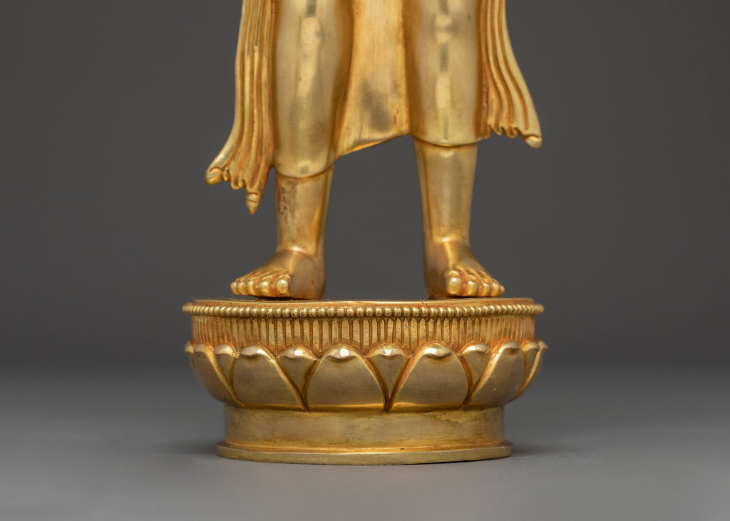 Maitreya Buddha Statue for Spiritual Meditation stands at 17.7” (45 cm) tall with a base width of 4.9” (12.5 cm) and weighs 3.33 kg. Made from a copper body, it is covered with a triple layer of 24K gold gilding and carved with deeply engraved carvings that produce a magnificent 3D-like effect. This sculpture, adorned with gemstones, handcrafted by expert Nepalese artisans, elegantly symbolizes Himalayan Buddhism's sacred traditions, making it an appropriate addition to altars, meditation places, or sacred collections.