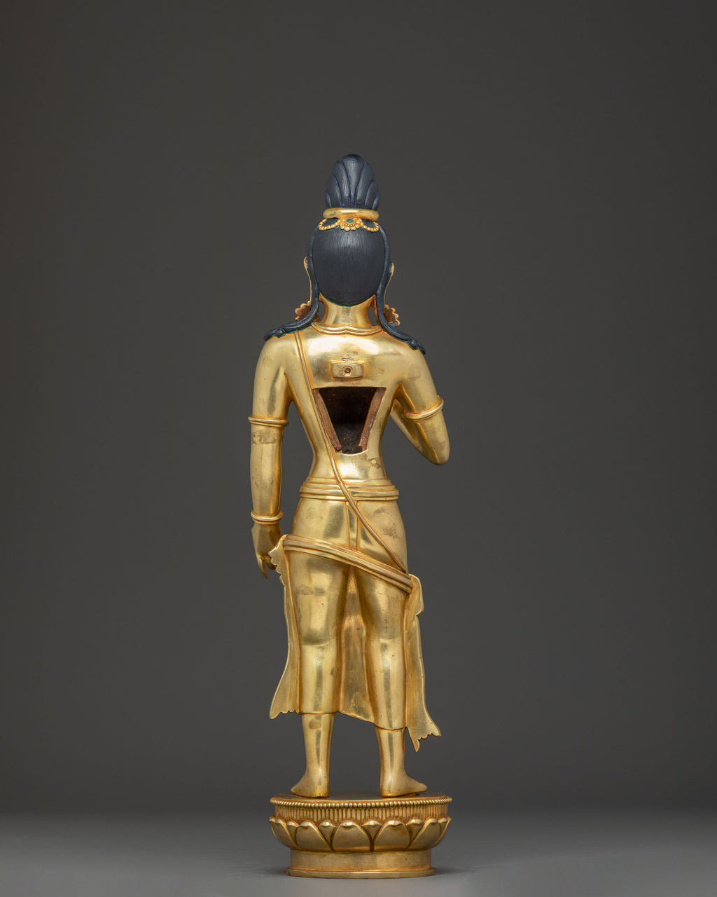 Maitreya Buddha, the future Buddha of loving-kindness and compassion, is depicted seated on a sun disc lotus base, symbolizing purity and the radiant nature of his enlightened mind. A stupa atop his head represents his connection to the Buddha’s teachings and his role in preserving the Dharma for future generations. His right hand is held in vitarka mudra, expressing teaching, discussion, and the transmission of wisdom, while his left hand holds a kalasha, signifying abundance, spiritual wealth, and the fulfillment of wishes. This depiction embodies hope, benevolence, and the promise of future enlightenment, making it a spiritually uplifting addition to any altar or meditation space.