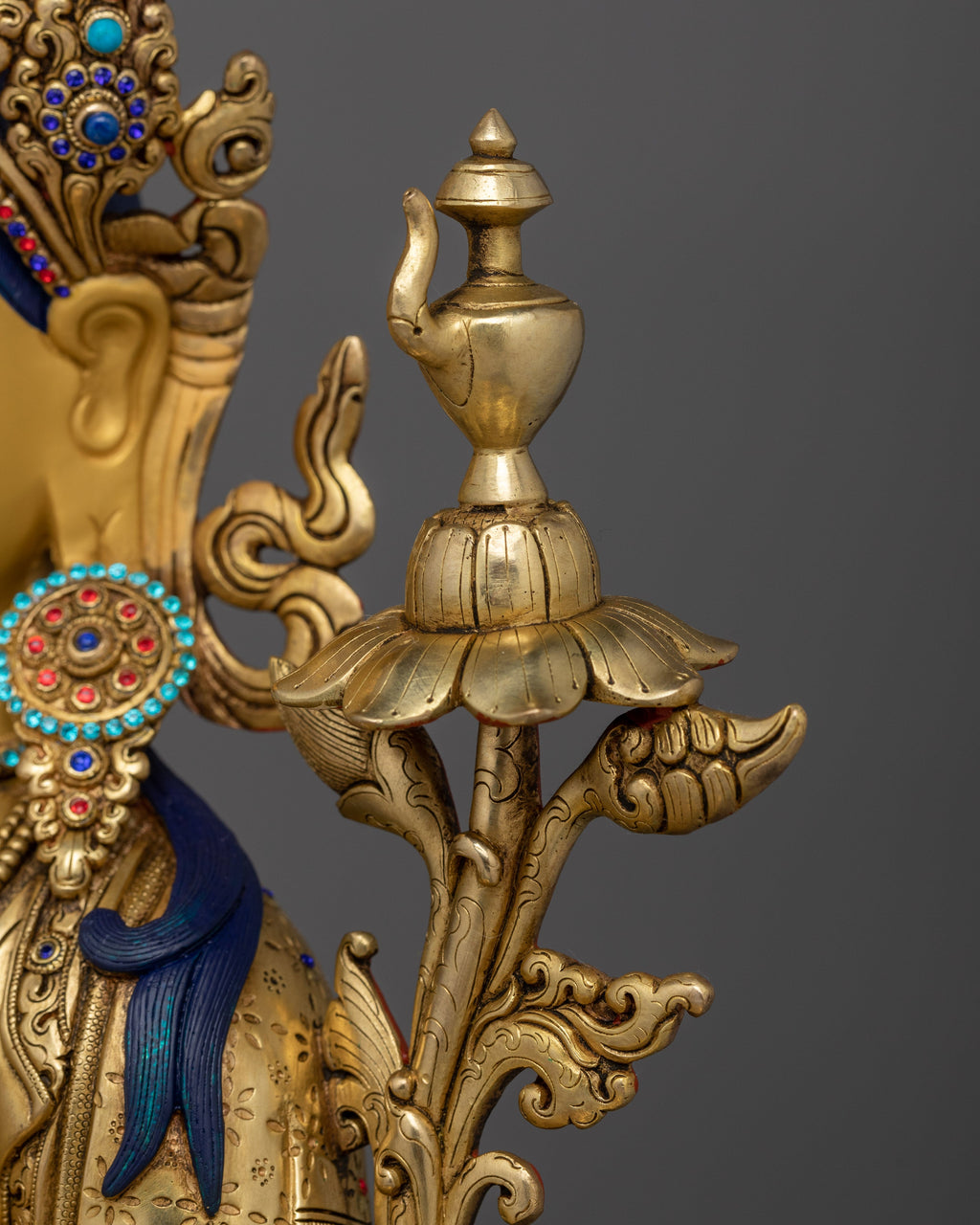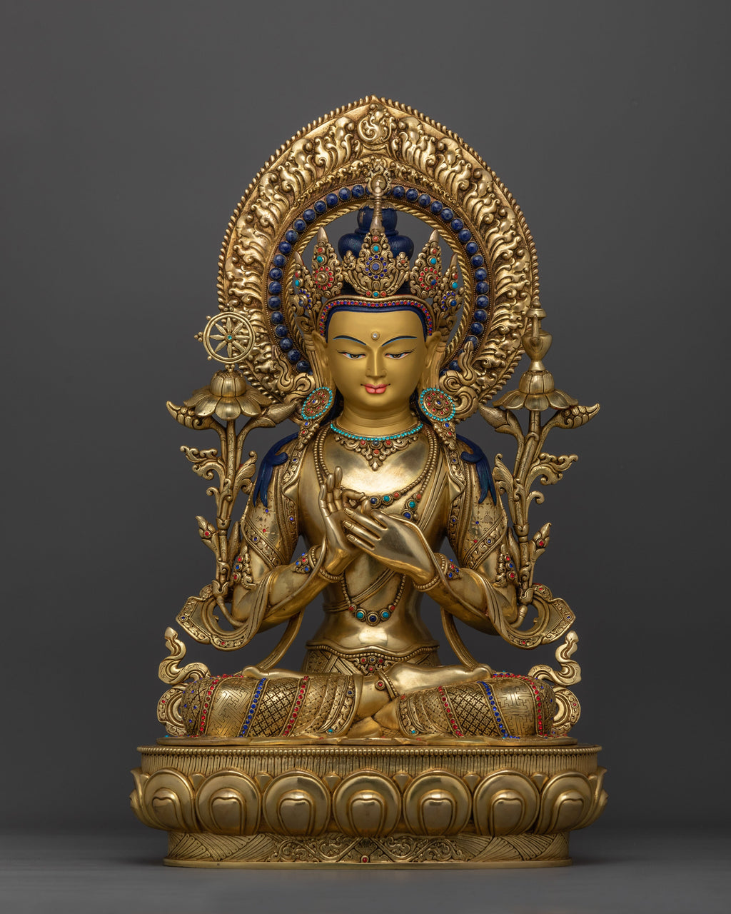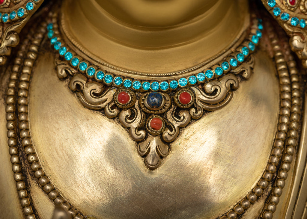 Maitreya Buddha Tusita Heaven Buddha statue is carved from the copper body delicately embellished with triple layers of 24K gold gilding, deeply engraved carving, and intricate acrylic & gold paintings. The statue is Western-style, symbolizing Maitreya's willingness to come down when the time is right. He holds either a stupa, symbolizing Buddha's relics, or a vase of immortality, symbolizing his capacity to grant longevity and spiritual prosperity. Maitreya's left hand is in the Varada mudra, symbolizing offering, giving, welcoming, generosity, and compassion, and his right hand is in the Abhaya mudra, symbolizing protection, kindness, peace, and fear dispelling.