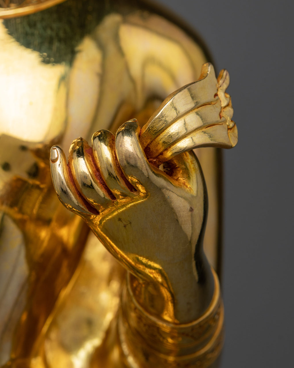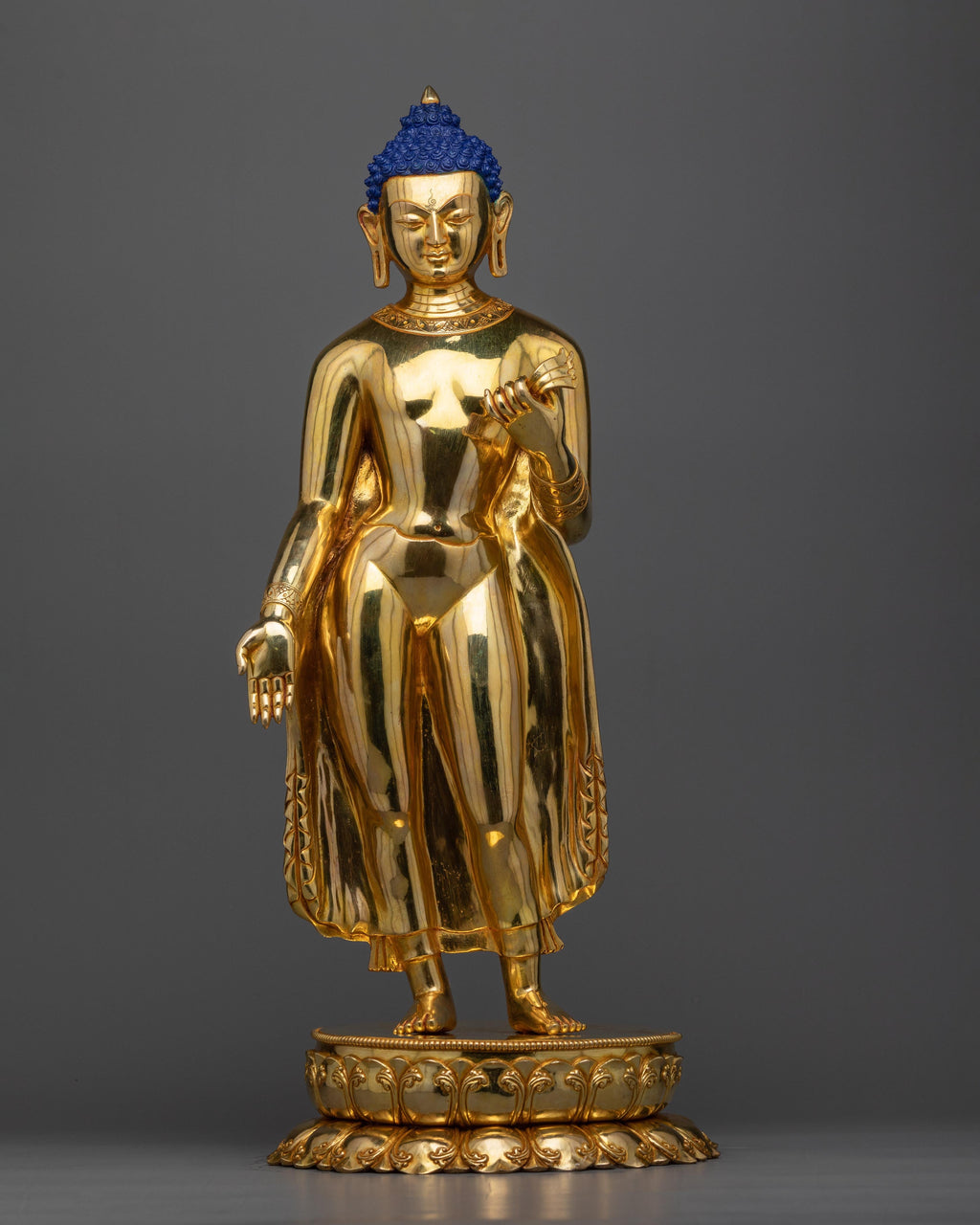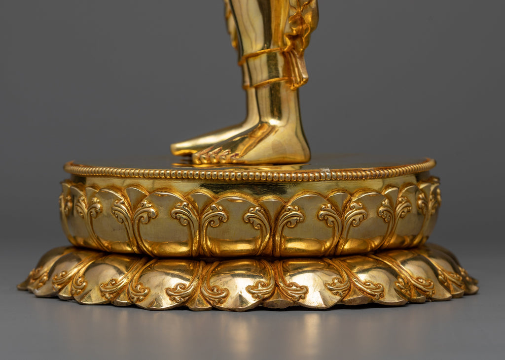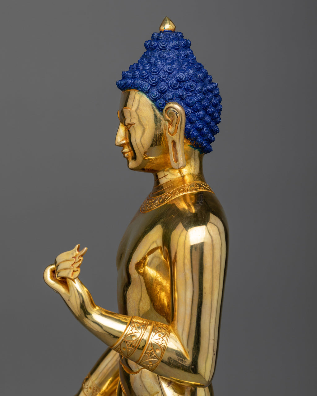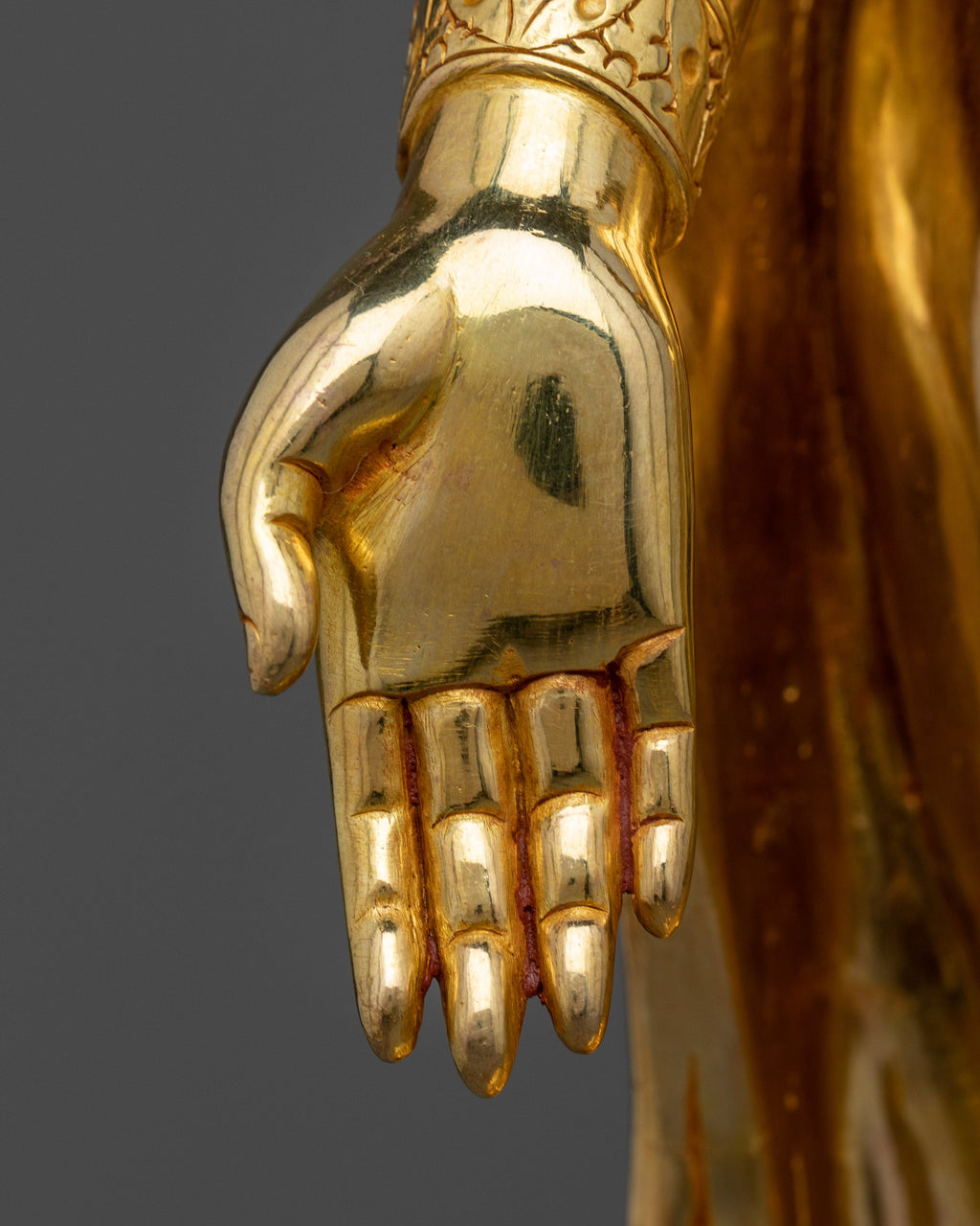 The sculpture is crafted of high-quality copper and is gilded with 24K gold for a glossy, rich finish that captures every feature of this stunning item. From the tranquil look to the exquisite patterns of the robes and lotus base, the craftsmanship conveys the profound essence of Shakyamuni Buddha. This statue represents tranquility and spiritual awakening, making it excellent for individuals who value Buddhist teachings or want to create a calm and mindful environment in their homes or meditation areas. Its presence in any room is sure to spark conversation, not only because of its breathtaking look but also because of the deep spiritual importance it possesses.