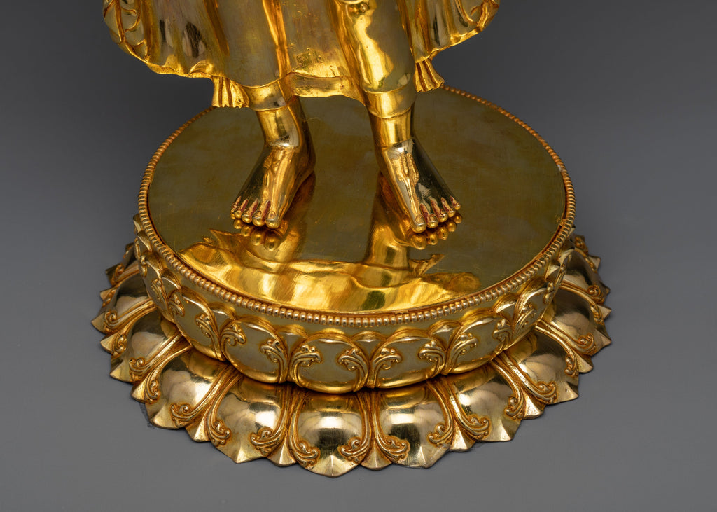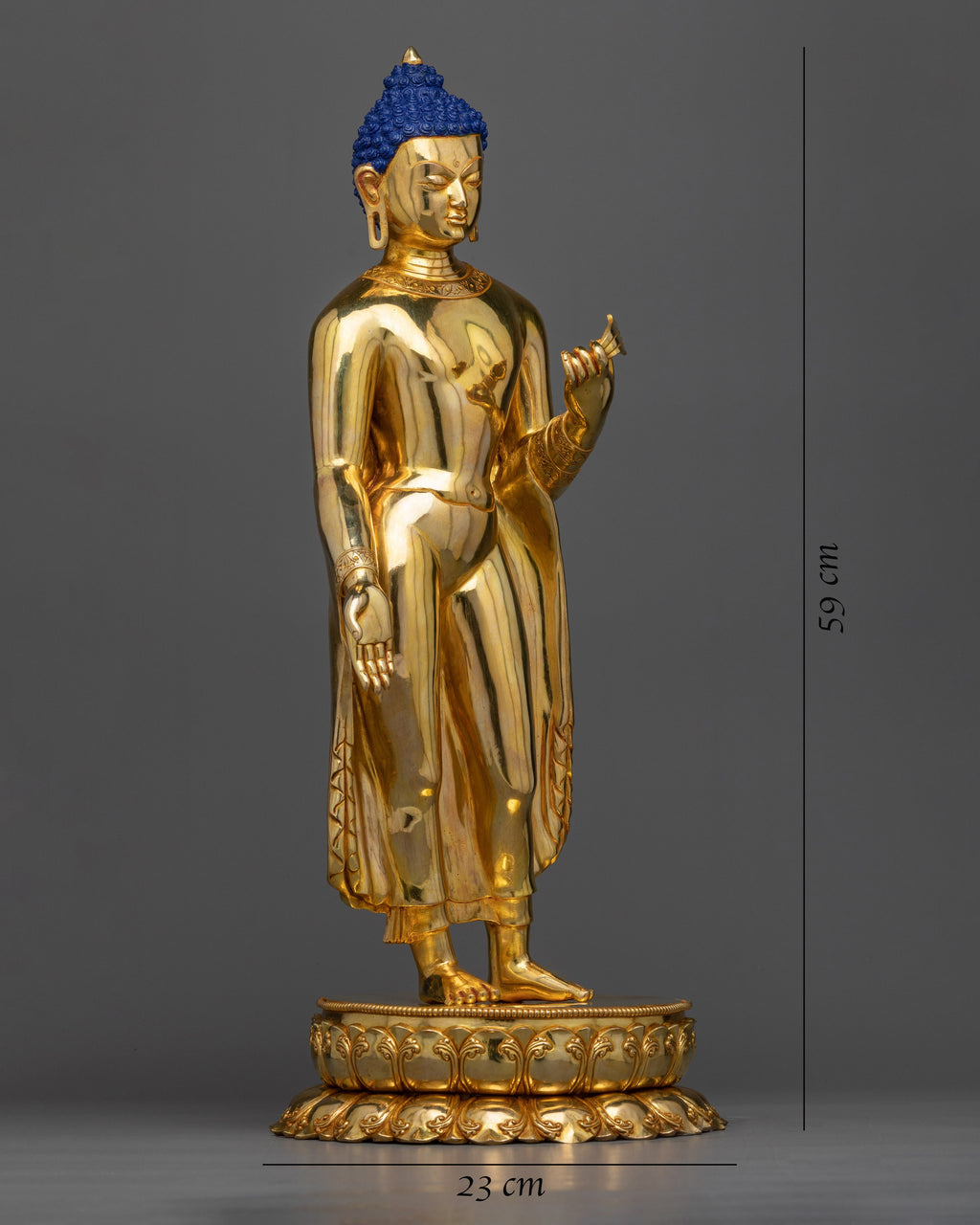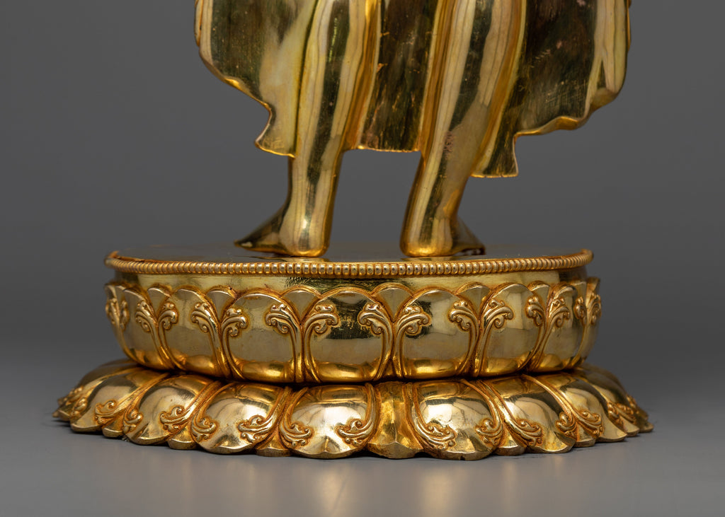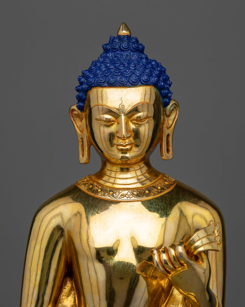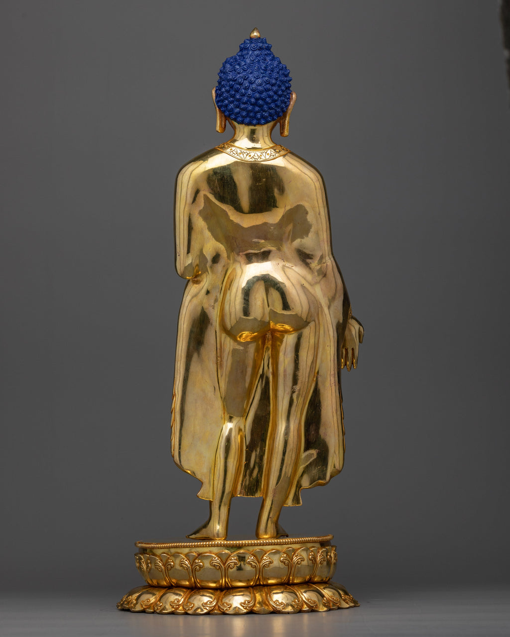 The sculpture is crafted of high-quality copper and is gilded with 24K gold for a glossy, rich finish that captures every feature of this stunning item. From the tranquil look to the exquisite patterns of the robes and lotus base, the craftsmanship conveys the profound essence of Shakyamuni Buddha. This statue represents tranquility and spiritual awakening, making it excellent for individuals who value Buddhist teachings or want to create a calm and mindful environment in their homes or meditation areas. Its presence in any room is sure to spark conversation, not only because of its breathtaking look but also because of the deep spiritual importance it possesses.