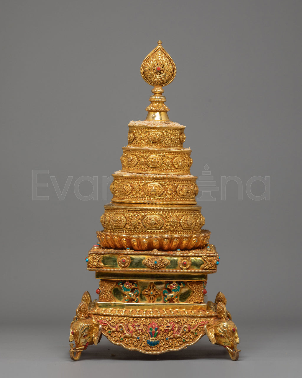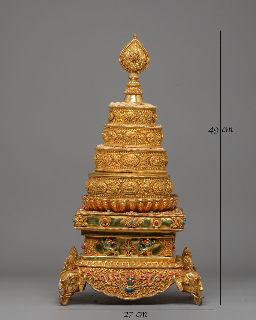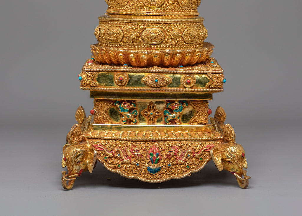 The multi-tiered structure depicts layered universes, each with elaborate designs, lotus petals, and auspicious symbols. The top finial resembles a precious diamond, representing the ultimate aim of enlightenment. The base is ornately embellished with protective deities, filigree patterns, and legendary elements that represent abundance, clarity, and divine protection. The colorful coral and turquoise stones offer sacred color associations: coral represents energy and protection, and turquoise represents spiritual balance and healing.