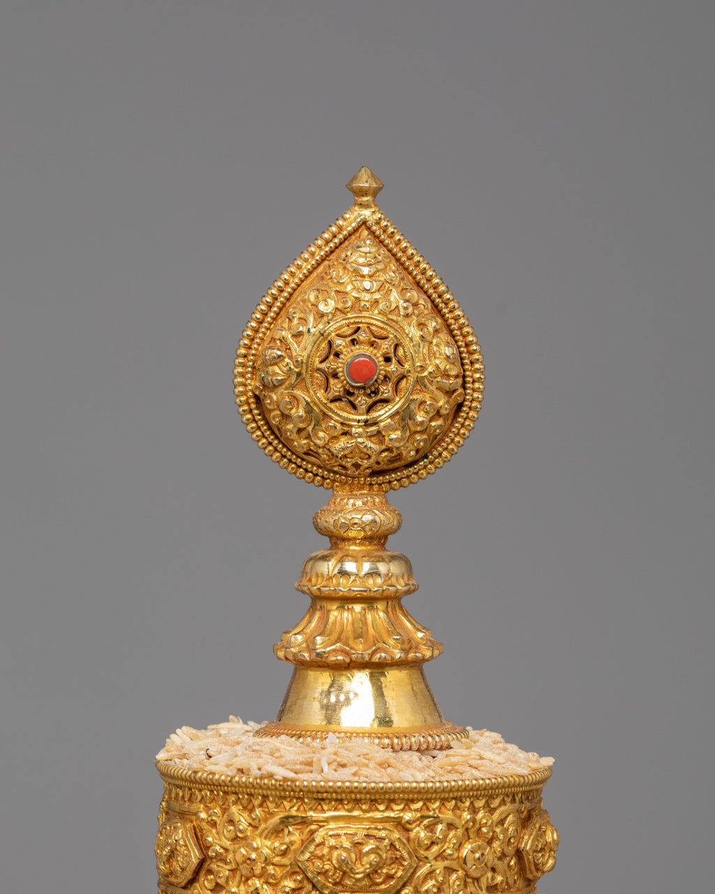 This Mandala for Sacred Ceremonies is a meticulously crafted ritual object made of copper and finished in fire-gilded copper. It stands 49cm tall and 27cm wide, weighs a substantial 4.02kg, and is an eye-catching centerpiece for any altar or ceremonial setting. This mandala, adorned with coral and turquoise stones, conveys deep traditional symbolism while adding to the visual richness of your spiritual surroundings.
