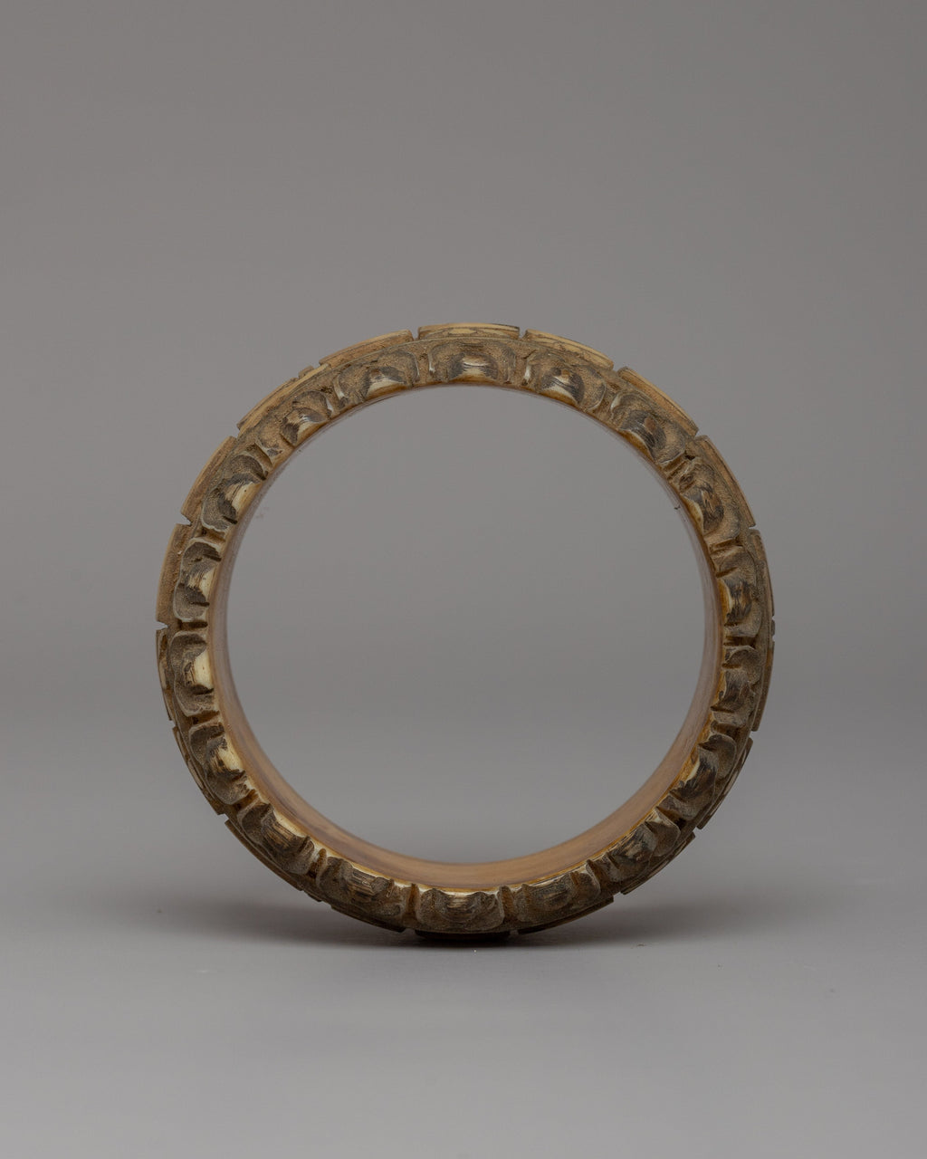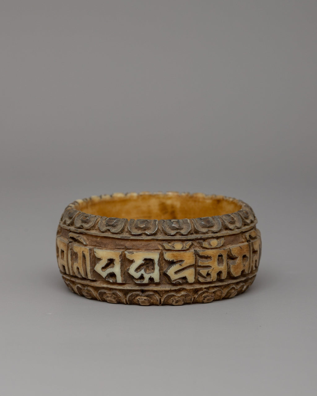 The bangle's design is frequently associated with the "Mani Mantra," a sacred Buddhist prayer representing Avalokiteshvara's compassionate energy, the Bodhisattva of Compassion. The bangle symbolizes the mantra's repetition, which is thought to invoke compassion and purify negative energies. Wearing this bangle is thought to connect the wearer to the blessings of compassion and peace, reminding them of the importance of kindness and selflessness in their daily lives.