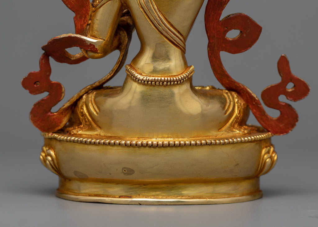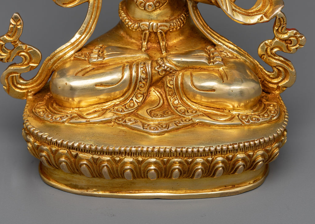 The statue is painstakingly gilded in 24K gold, emphasizing the delicate intricacies of Manjushri's form and features. The combination of gold and acrylic paintings on the copper body casts a warm, reflected light on the statue. Manjushri is shown holding a sword in one hand, symbolizing the severing of ignorance, and a lotus blossom in the other, symbolizing purity and enlightenment.