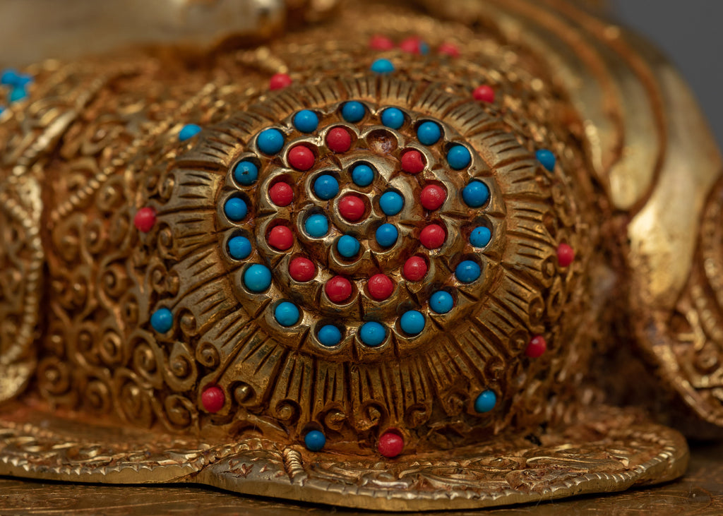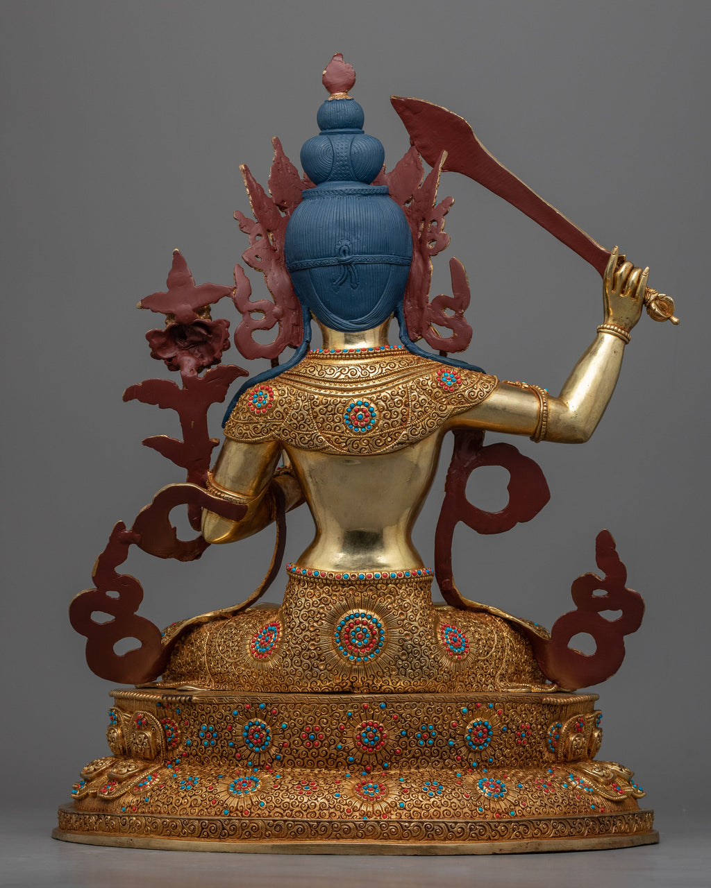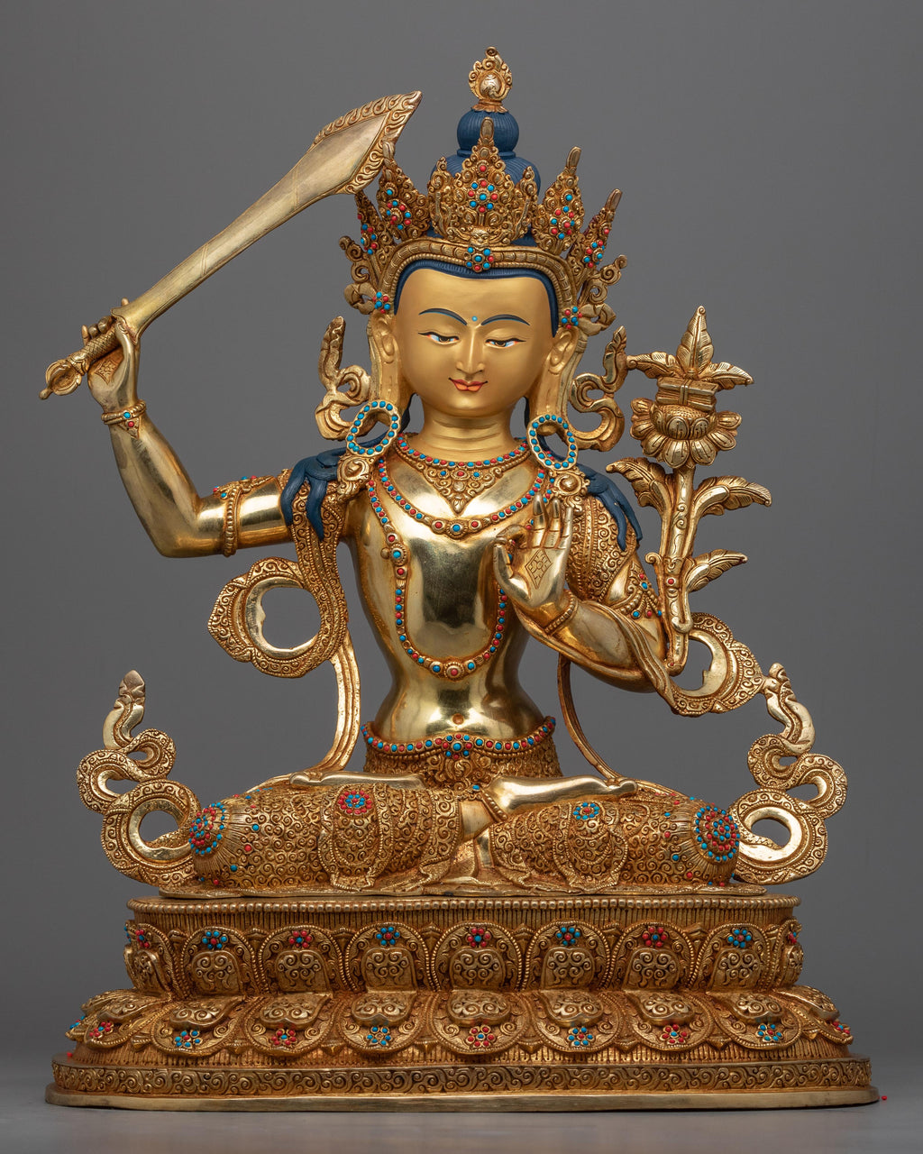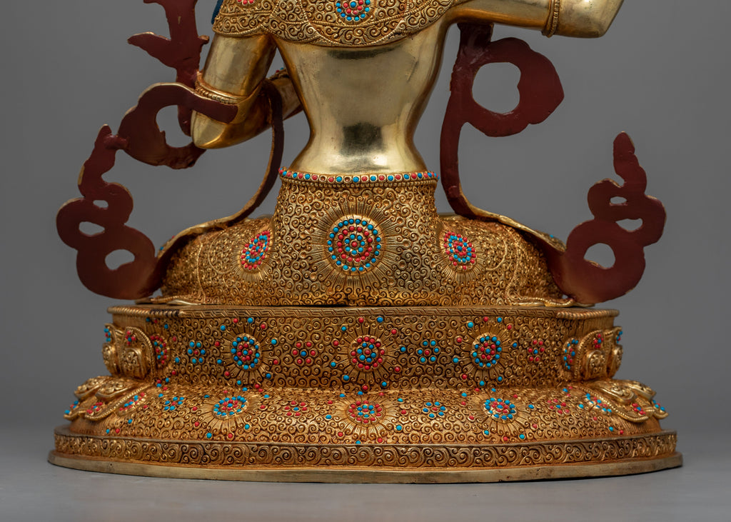 Delicately handcrafted in our workshop, the traditional Manjushri bodhisattva of wisdom statue is intricately designed with unique Nepali motifs. The statue is carved out of copper, gilded in gold, and highlighted with acrylic paints. The bodhisattva is shown sitting on a moon disc lotus seat with a compassionate look and a fiery sword, signifying his capacity to slay ignorance and negativity. His right-hand forms the "Vitraka Mudra," which means the Buddha's teaching is transmitted. After months of diligent labor, our artisans have created a stunning sculpture.