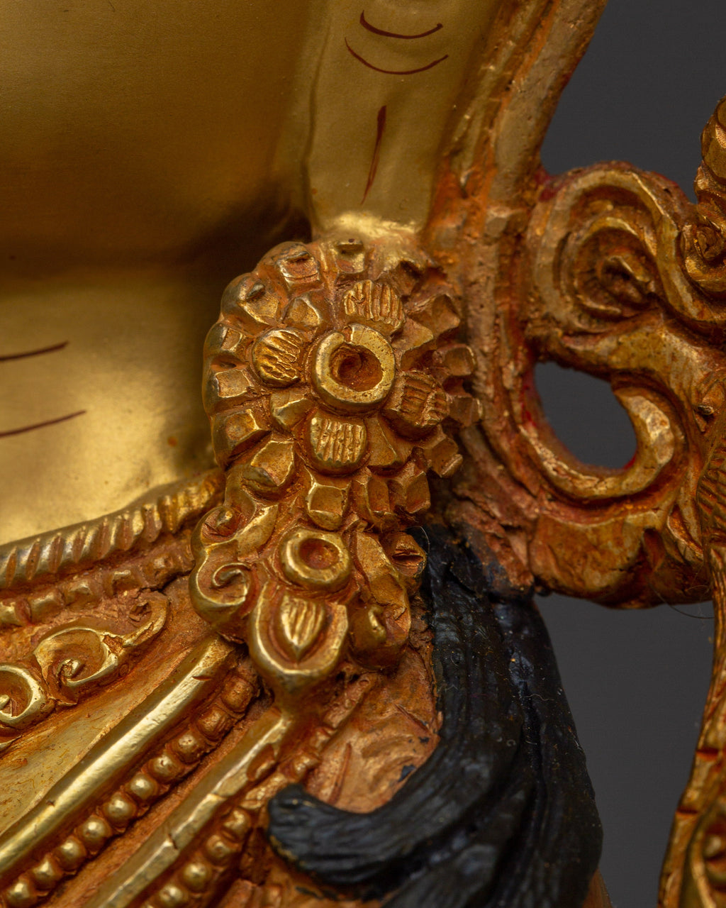 This statue, seated in a lotus position, reflects the spirit of Manjushri's infinite knowledge and purity through its colorful, dazzling gold and detailed workmanship. The piece's intricate craftsmanship and royal presence make it an ideal focal point for any shrine, altar, or meditation place. His stance and face convey serenity, attention, and clarity, making him ideal for individuals looking to enhance their spiritual practice or bring knowledge into their home.