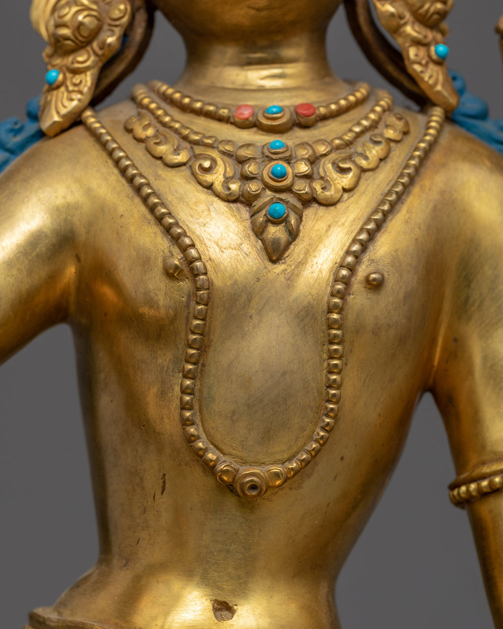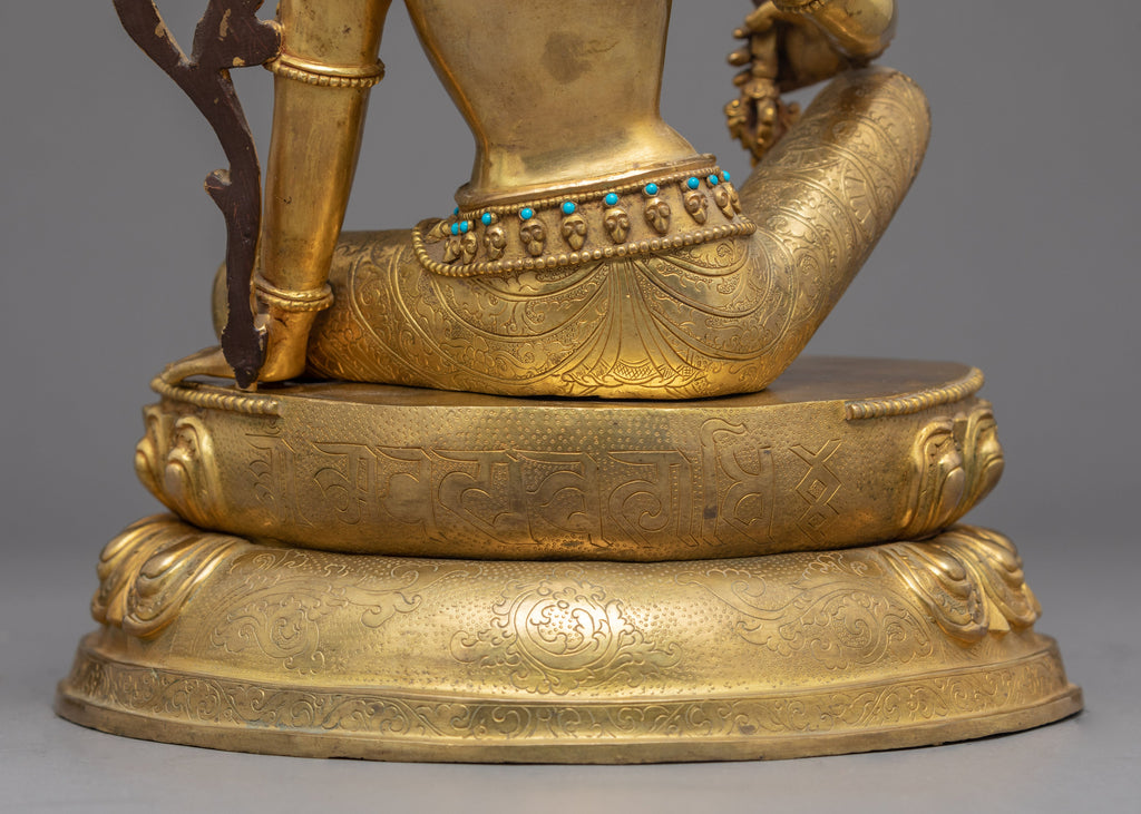 We are Nepali sculpting artists with the skills passed down to us for generations and have carved this antique finished statue of Manjushri with the sword in our studio. We molded the body of the wisdom deity in a copper body and gilded it with genuine 24k gold. The deity depicts sitting on a moon disc of a lotus seat with a peaceful expression, holding a sword in his right hand and left hand resting on a lotus seat.