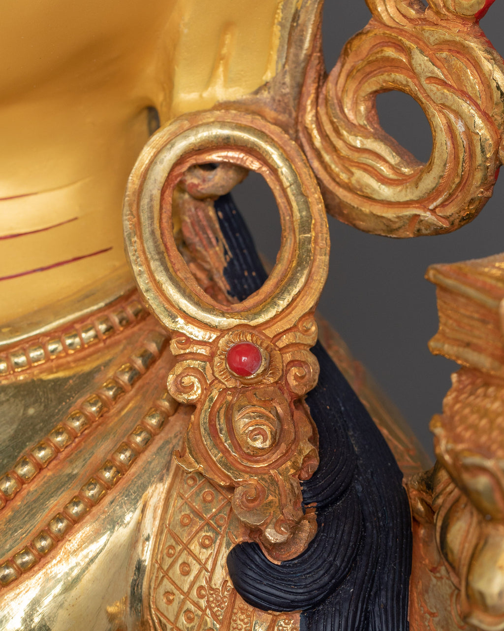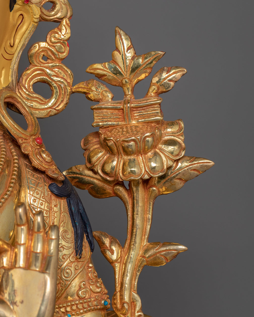 Manjushri is depicted holding the flaming sword of wisdom, symbolizing the cutting through of ignorance, and the Prajnaparamita Sutra, embodying ultimate knowledge. This detailed statue, with its serene expression and ornamental design, serves as a profound object of devotion of Buddhist art.