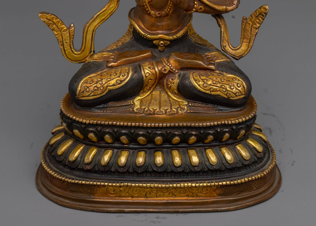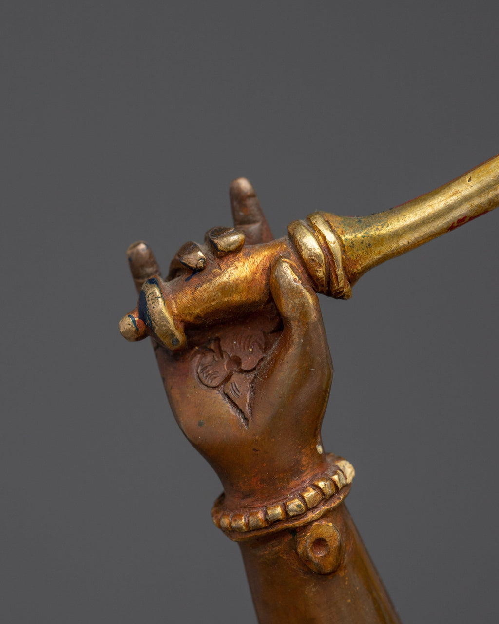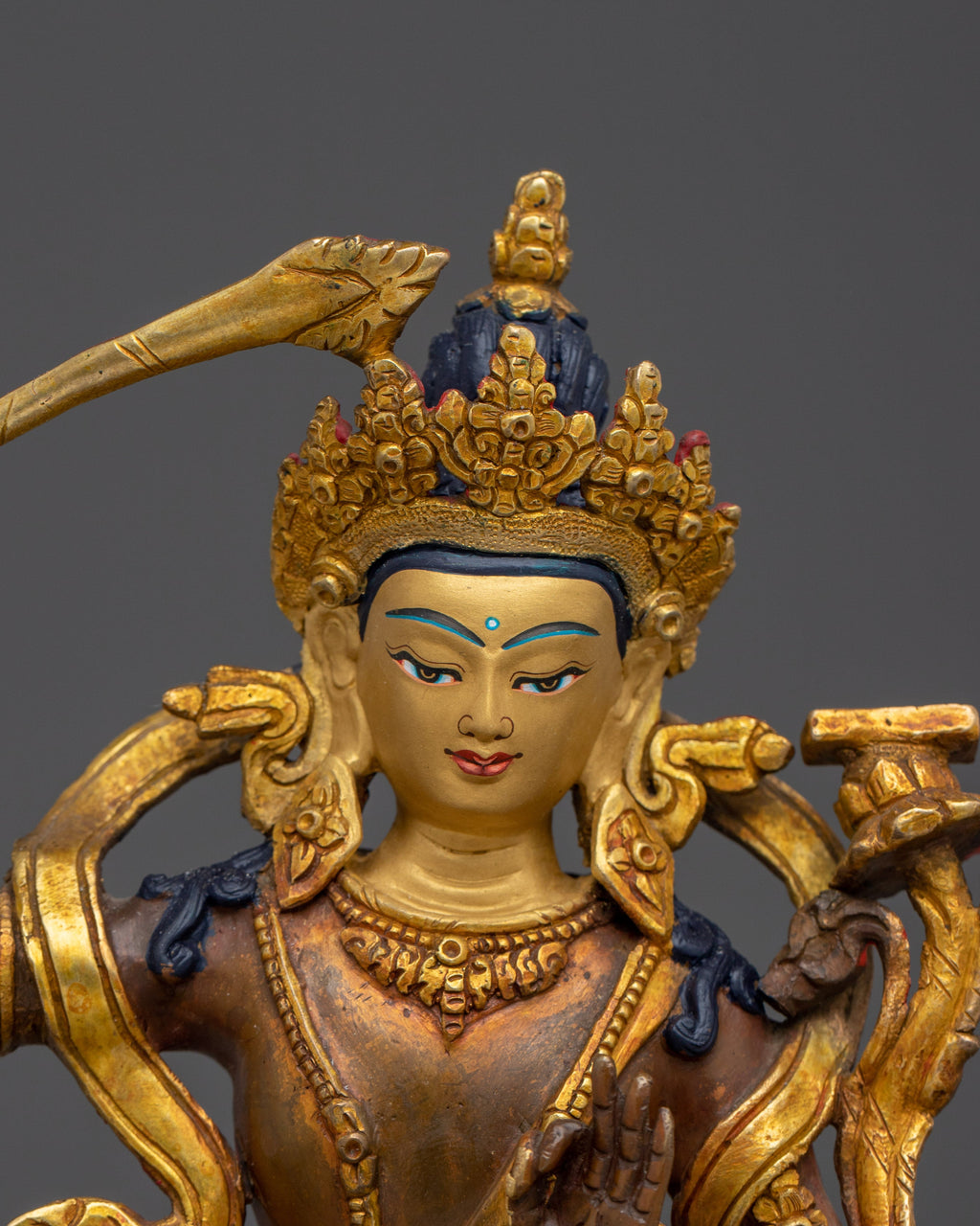 Manjushri, the wisdom deity in buddhist tradition stands at 9.8 inches (25 cm) in height with a base width of 6.9 inches (17.5 cm), and weighs approximately 2 kilograms. Made from a solid copper body, it is beautifully adorned with 24K gold gilding and enhanced with detailed gold and acrylic paintings. The combination of rich materials and skilled artistry highlights the serene presence and symbolic grace of Green Tara, making it a meaningful piece for personal altars, meditation spaces, or spiritual decor.