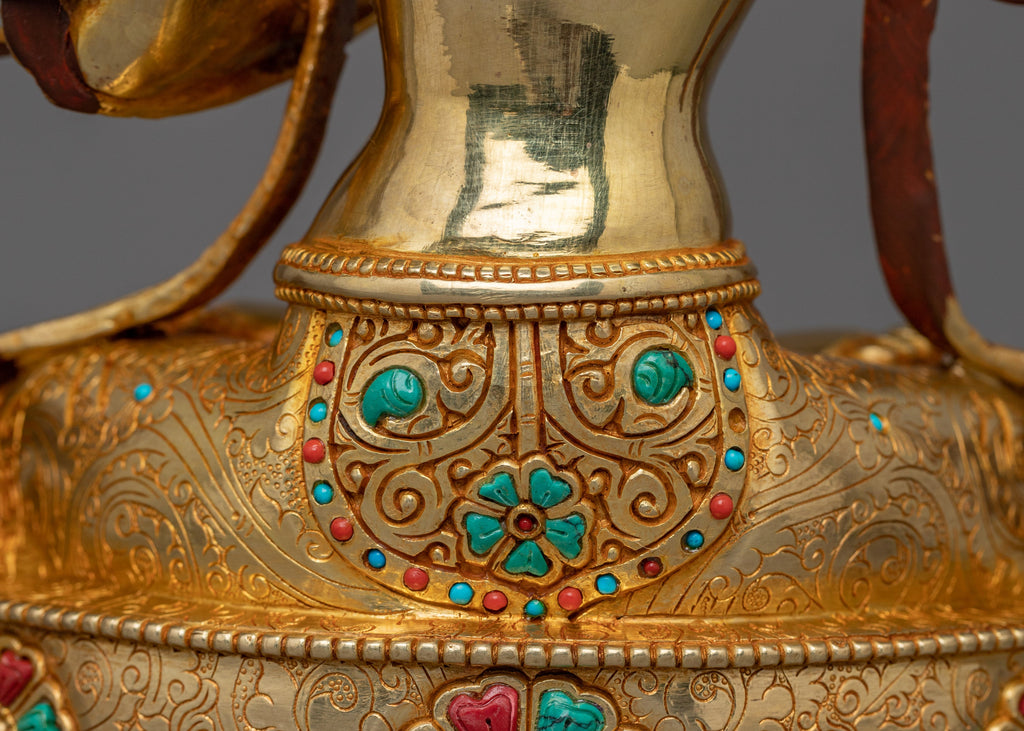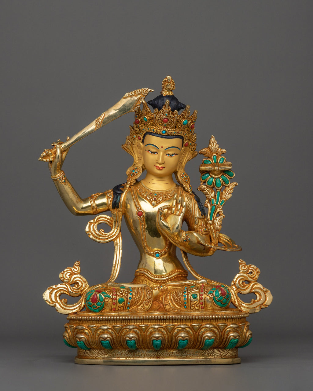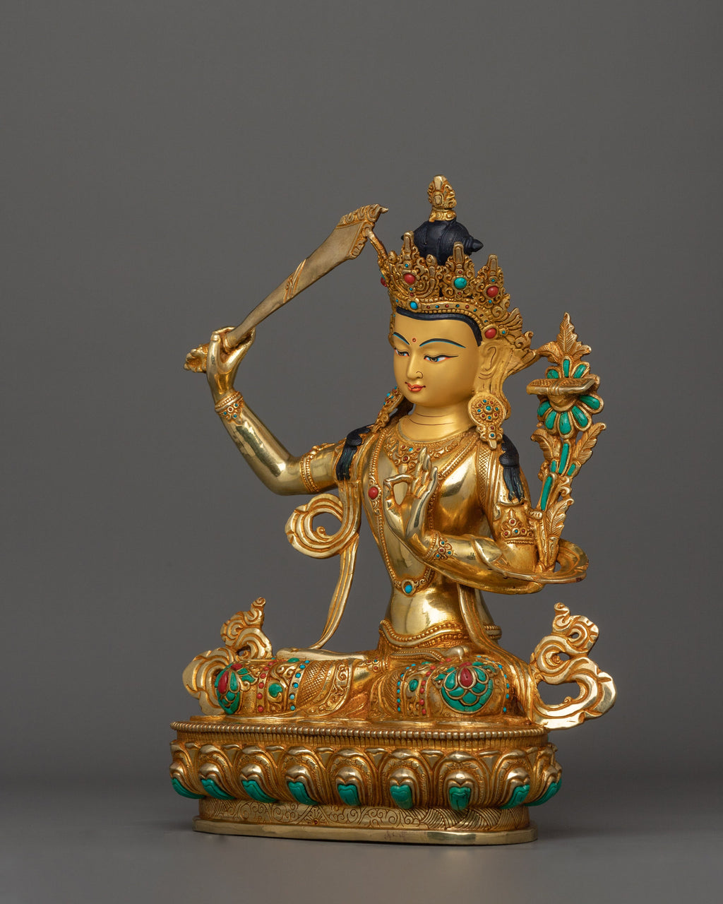 This handmade golden statue of Manjushri, the Bodhisattva of Divine Wisdom, measures 13.2”/33.5cm in height and 10.8”/27.5cm at the base, with a weight of 3.28 kg. Expertly crafted from a copper body, it is richly adorned with 24K gold gilding, detailed gold and acrylic paintings, and hand-carved gemstones. Blending traditional artistry with symbolic depth, this piece is ideal for meditation spaces, personal altars, or as a thoughtful decorative item that reflects the pursuit of wisdom and clarity.