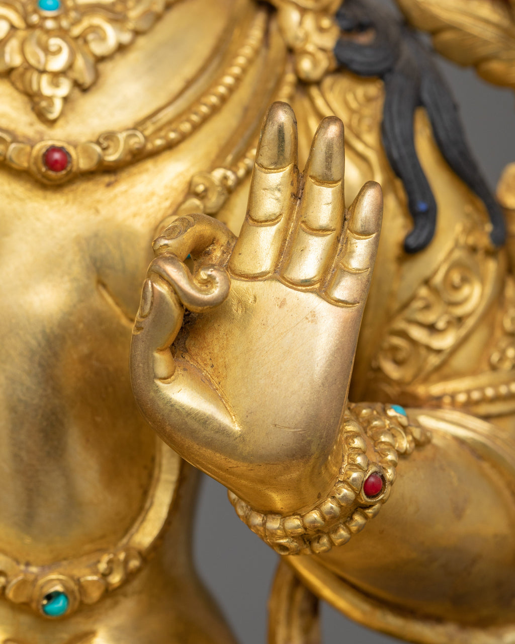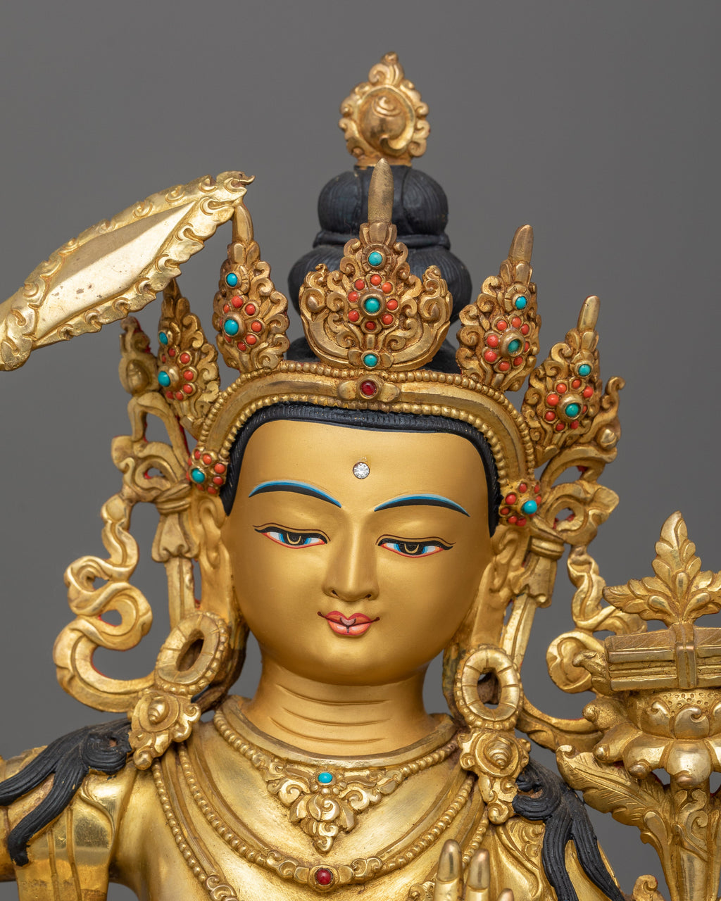 Manjushri, the Bodhisattva of Wisdom, is represented here in a seated position, radiating calm and clarity. On the one hand, he wields his renowned flaming sword, indicating the ability to cut through ignorance, while on the other, he carries the Prajnaparamita Sutra, which represents ultimate wisdom. His tranquil demeanor and intricate decorations represent his duty as a counselor to enlightenment. This statue, rich in symbolic components, serves as a powerful reminder of wisdom's transformative potential and would make an excellent addition to any collection or meditation space.