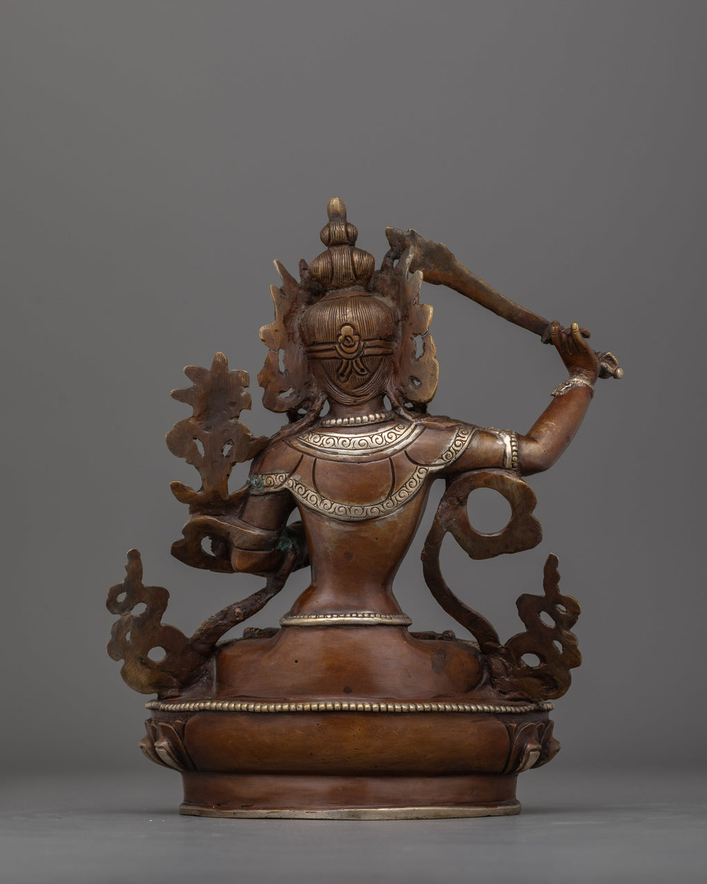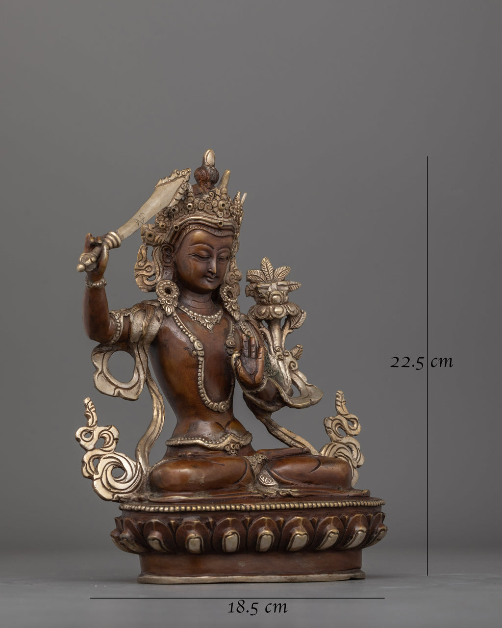 This wisdom statue holding the Sword of Awareness stands 8.9 inches tall with a 7.3-inch base and was created in Patan, Nepal, a city identified for its traditional metalworking talent. It is made of oxidized copper and silver-plated, which reflects strength and beauty, with precise features that showcase the artist's craftsmanship.