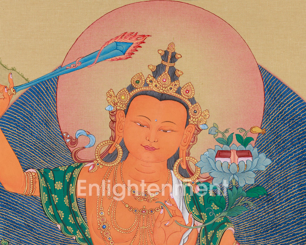 Manjushri, the Bodhisattva of Wisdom, is one of the most revered figures in Tibetan Buddhism. As the embodiment of wisdom, knowledge, and insight, Manjushri is depicted holding a sword and the Prajnaparamita Sutra, symbolizing the cutting of ignorance and the pursuit of enlightenment. Many practitioners seek his ability to impart clear wisdom and understanding on their journey to enlightenment and awakening. Manjushri is considered the patron of scholars, sages, and those seeking profound knowledge, and his wisdom is regarded as a guide for both spiritual and intellectual growth.