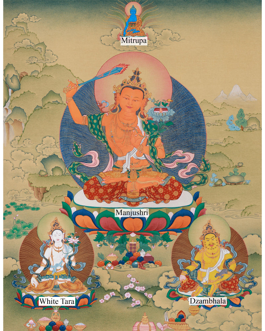 In this thangka, Manjushri is depicted at the center, seated in a meditative posture on a lotus throne, surrounded by White Tara, Dzambhala, and Mitrupa. White Tara, the goddess of compassion and longevity, is shown to the right, radiating serene and peaceful energy, with a calming presence that complements Manjushri’s wisdom. To the left of Manjushri, Dzambhala sits as a protector and guardian of wealth, holding the power to grant material and spiritual abundance. Above them, Mitrupa, a revered Tibetan master, is depicted, symbolizing the transmission of teachings and spiritual mastery.