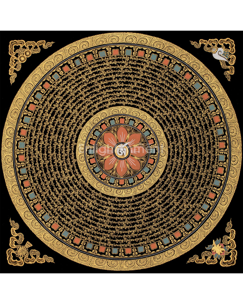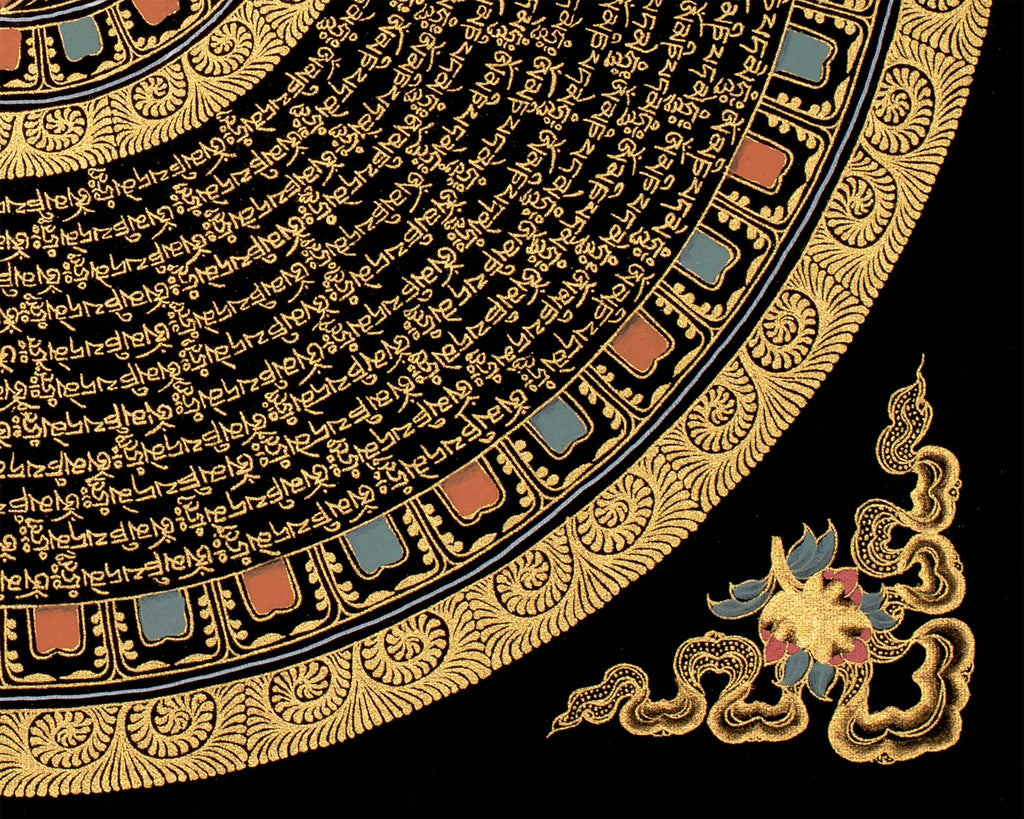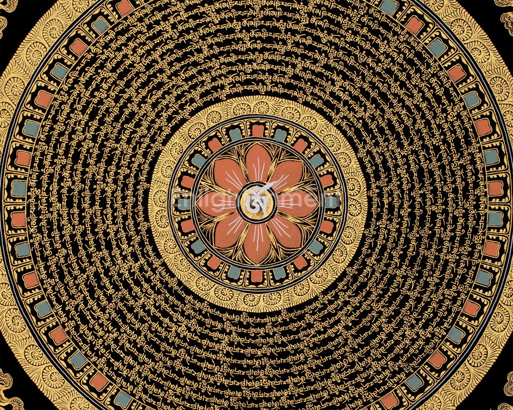 A Mantra Mandala is a spiritual artwork that blends the power of mantras and sacred geometry. Combining intricate patterns and symbols with a central mantra, Mantra Mandalas serve as aids for meditation and intention. As practitioners focus on the geometric design while contemplating the mantra, they aim to harness its spiritual energy for healing, transformation, and self-discovery. Found across cultures and traditions, these mandalas offer a harmonious fusion of artistic expression and spiritual practice, amplifying the vibrations of the mantra and aiding in concentration, inner exploration, and connection to higher realms of consciousness.