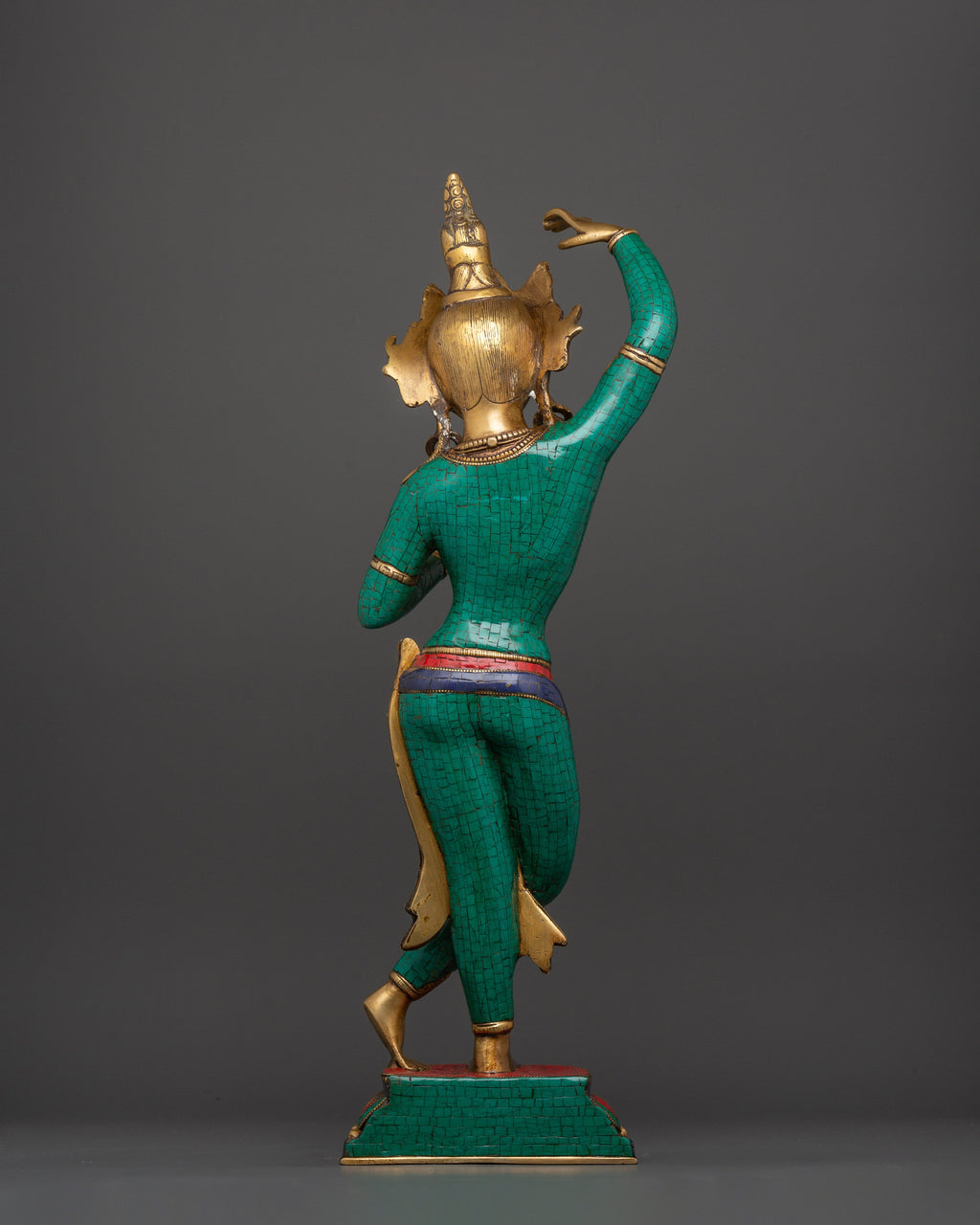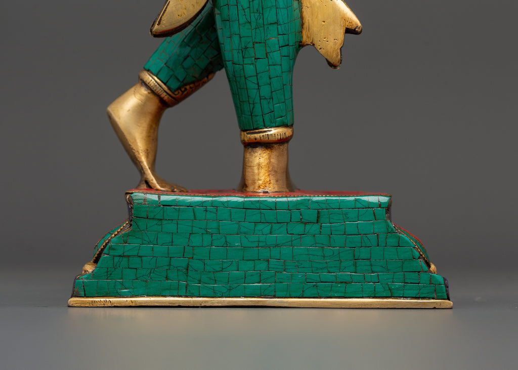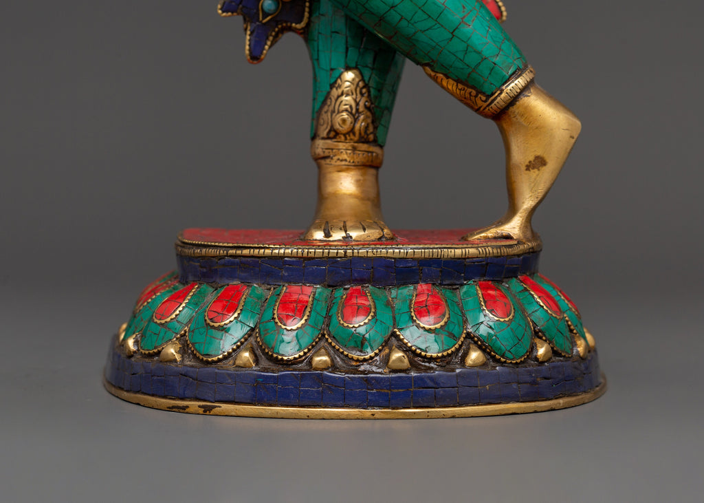 This magnificent Maya Devi Brass Statue, which is finely carved from brass and inlaid with Artificial turquoise and coral stones, represents the sacred essence of motherhood and spiritual awakening. This magnificent sculpture, which stands 53 cm tall and weighs 5.19 kg, depicts Maya Devi, the mother of Siddhartha Gautama (Buddha), in her well-known dance position, signifying eternal balance, divine protection, and the incredible event of creation.