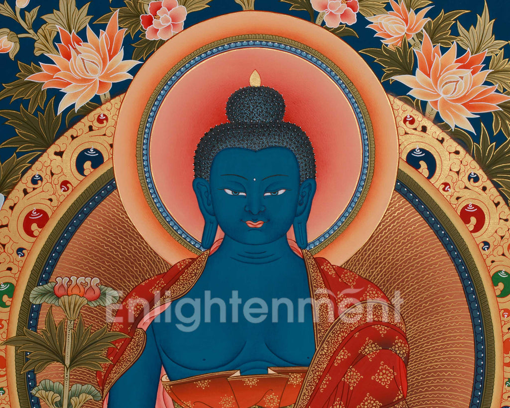 Created by talented Tibetan artisans employing traditional methods, this thangka employs vivid acrylic hues to vividly portray the Medicine Buddha. His figure is encircled by detailed floral designs that deepen the spiritual meaning of the artwork. Genuine 24 K gold accents emphasize the intricate halo and decorative patterns, providing a sacred and opulent element to the piece. The bold blue of the Medicine Buddha symbolizes his purifying abilities, bringing both healing and tranquility.