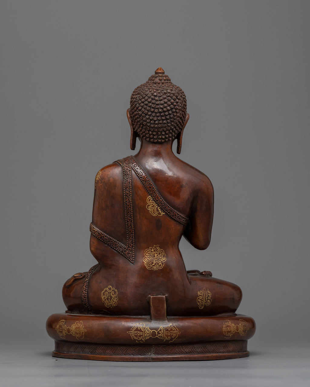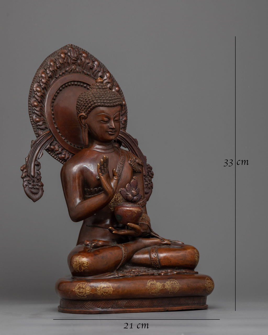 The statue is made of oxidized copper. He is sitting on a cushion with a calm expression, holding a bowl of healing herbs. His right hand is in abhaya mudra, a gesture of reassurance, blessing, and protection. Our artists have beautifully painted a vajra on his seat and robe, adding a beautiful touch of this profound ritual object.