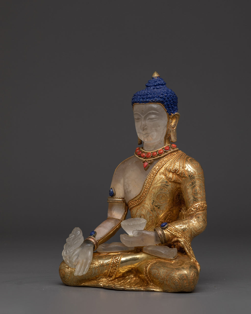 This Supreme Healer Medicine Buddha Healing Statue measures 8.7”/22cm in height and 6.5”/16.5cm at the base, with a weight of 1.56 kg. Made from a crystal body richly adorned with 24K gold gilding and detailed gold and acrylic paintings, this statue radiates clarity and healing presence. Expertly handcrafted by skilled Nepali artisans, it makes a meaningful addition to personal altars, meditation areas, or healing spaces, symbolizing restoration, balance, and the power of enlightened medicine.