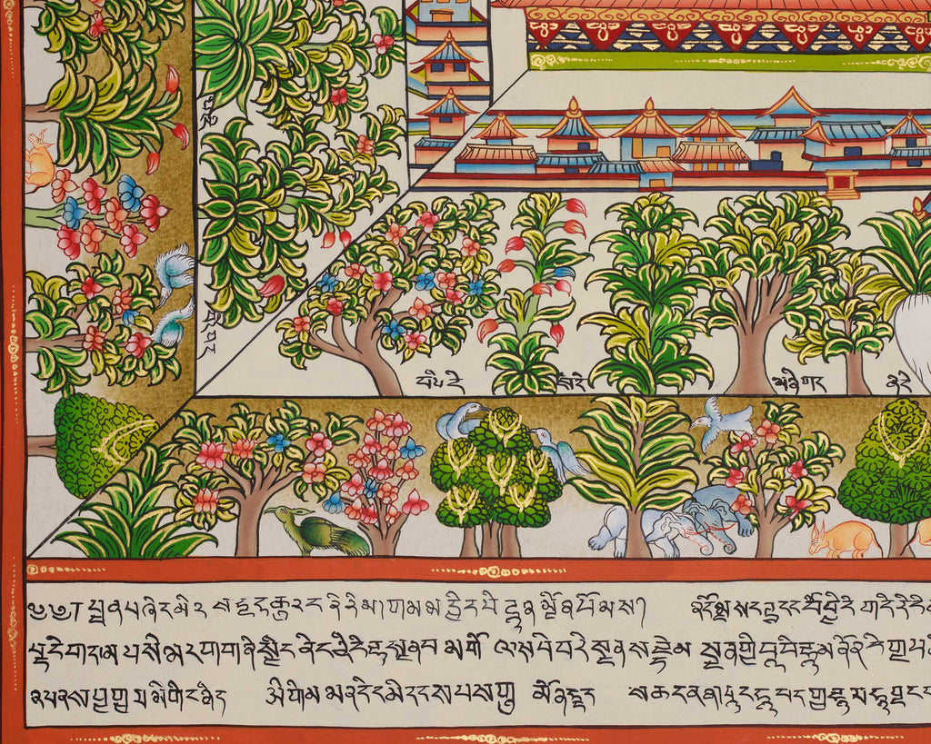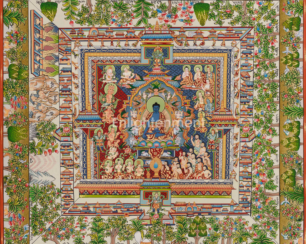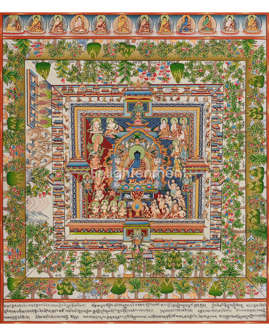 In this thangka, the central Medicine Buddha sits within an ornate palace, surrounded by an assembly of enlightened beings arranged in perfect symmetry. Floral borders, lush vines, and decorative motifs soften the geometry, symbolizing renewal and vitality. The outer registers feature lineage Buddhas and textual inscriptions, grounding the mandala in authentic tradition. The entire composition draws the eye inward, encouraging calm observation and meditative absorption. This Medicine Buddha mandala is ideal for a healing room, meditation space, or sacred collection—invite its restorative energy into your environment and cultivate balance, clarity, and well-being in your daily practice.