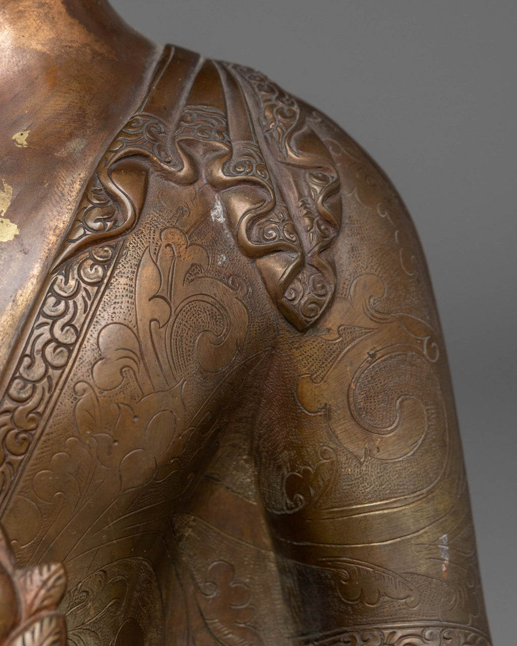 This Medicine Buddha statue stands 31 cm tall and 20.5 cm wide, weighing 2.3 kg. Crafted from oxidized copper, it reflects skilled craftsmanship and attention to detail. Its serene presence makes it a meaningful addition to personal altars, meditation areas, or spiritual collections, offering both aesthetic beauty and spiritual inspiration. Perfect for those seeking to enhance healing energy, cultivate mindfulness, and invite calmness into their sacred spaces, this statue embodies the timeless wisdom and compassionate energy of the Medicine Buddha.