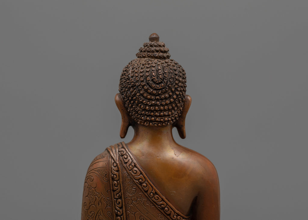 Medicine Buddha with Healing Nectar statue stands 5.5"/14cm tall, with a base of 4.1"/10.5cm and a weight of 0.600 kg. This serene figure made of oxidized copper embodies the essence of Bhaisajyaguru, the Buddha of Healing. This statue is a strong depiction of the Medicine Buddha's compassion and healing abilities, making it an excellent choice for meditation and prayer.