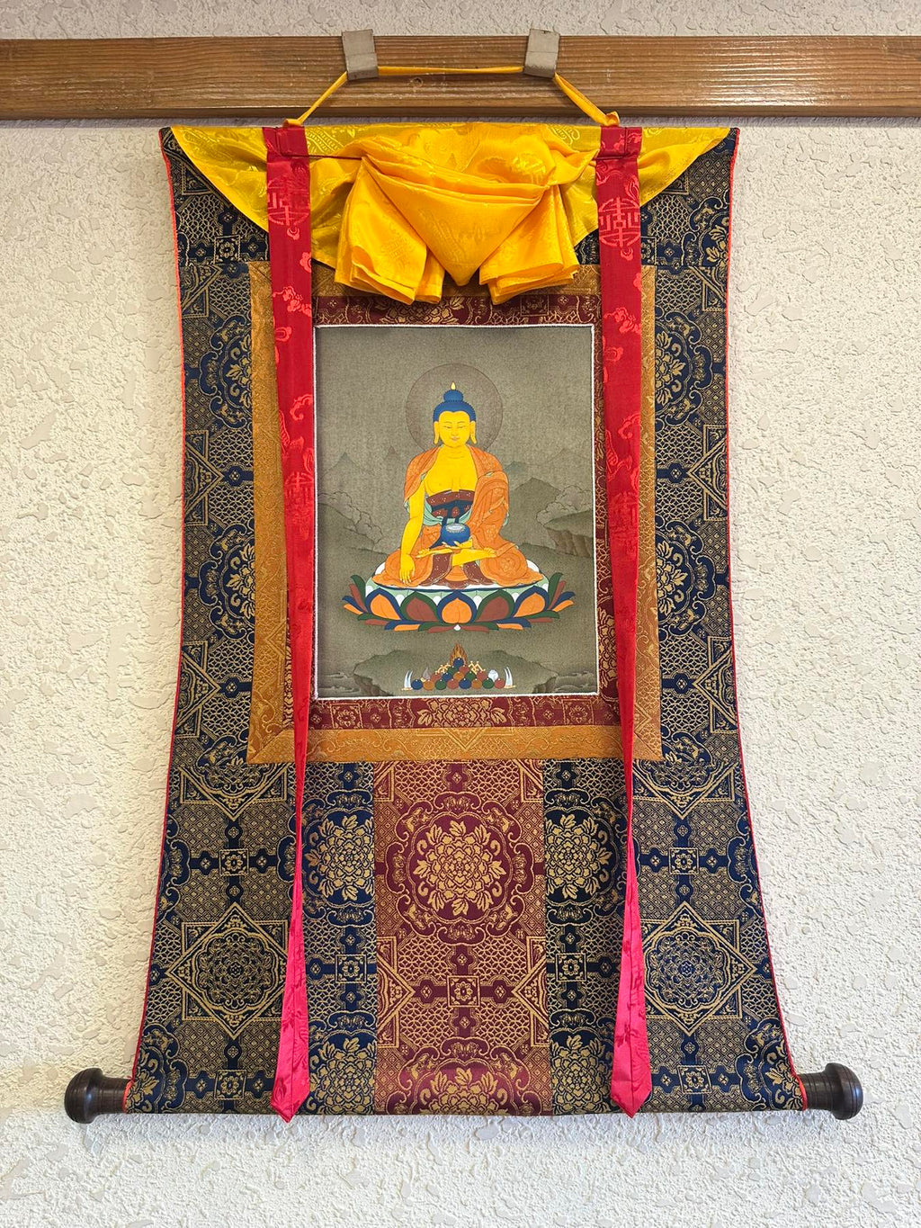 Hand-painted with devotion, this Meditating Buddha Shakyamuni Thangka is created on fine cotton canvas using genuine 24K gold and acrylic colors. Made in our Enlightenment Studio, the painting adheres to the refined Karma Gadri style, renowned for its luminous colors, spacious compositions, and naturalistic landscapes. Every detail is carefully layered, with 24K gold highlighting the sacred aura, ensuring the thangka radiates both artistic brilliance and spiritual depth. This is not a reproduction but a true original thangka, completed entirely by hand, carrying the blessings of tradition and artistry.