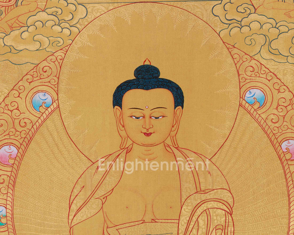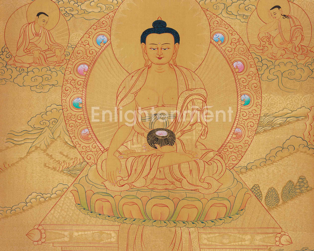 Serene and spiritually profound, this Meditating Buddha Shakyamuni thangka captures the peaceful essence of the historical Buddha in a moment of deep meditation and enlightenment. Hand-painted on cotton canvas with refined acrylic colors and accented with genuine 24K gold, this artwork showcases the exceptional craftsmanship of a skilled Nepali artist dedicated to traditional thangka painting. The soft golden background and delicate linework create a calm, luminous presence that radiates tranquility and spiritual harmony.