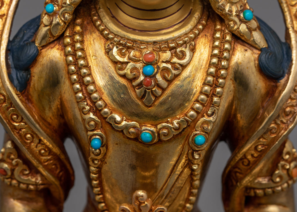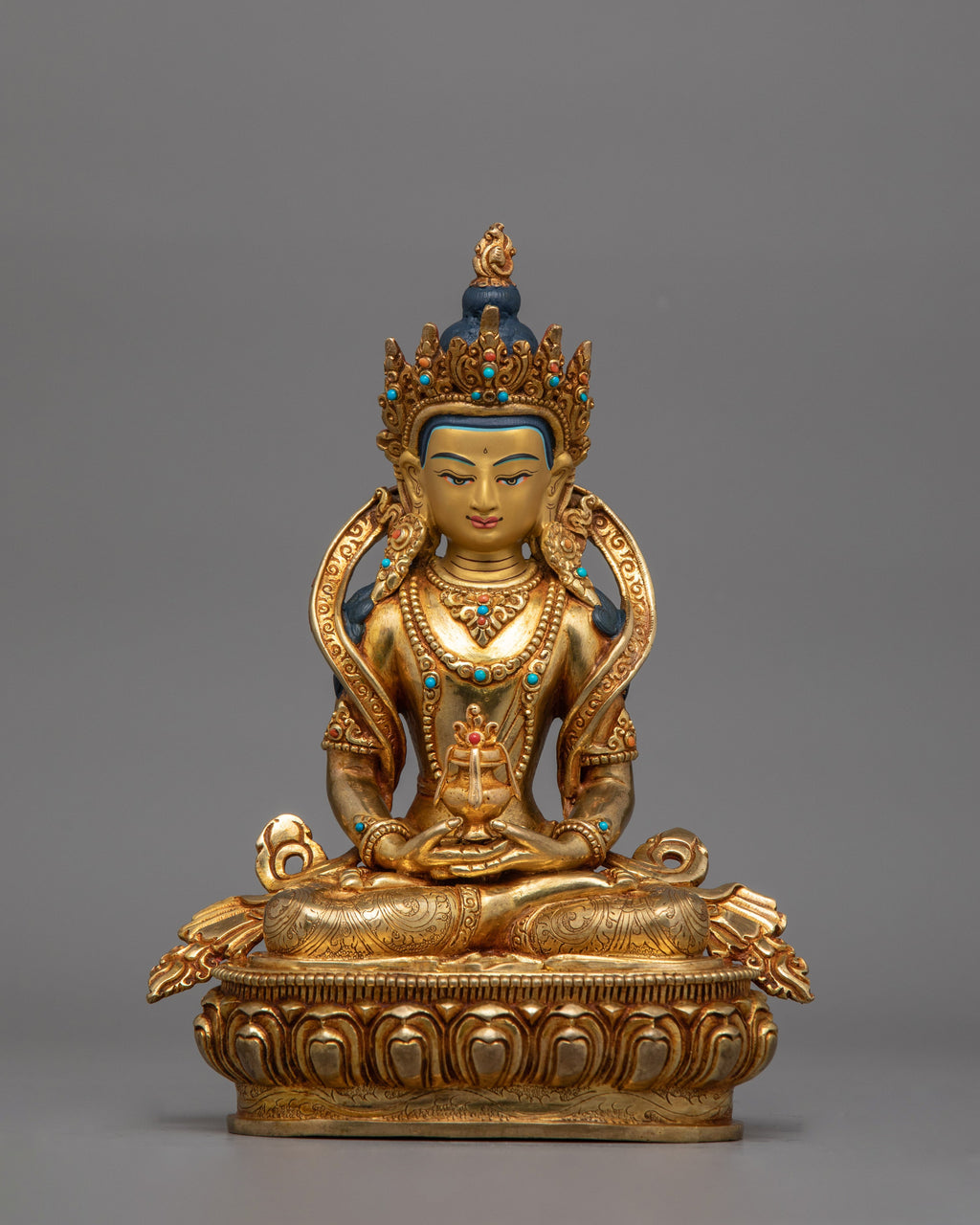 Amitayus is represented sitting in a meditative posture, indicating his vast wisdom and unwavering concentration. His hands are in dhyana mudra, holding a kalasha, a holy vase filled with the nectar of immortality representing his function as the giver of long life and energy. His calm demeanor radiates compassion and inner peace, Inspiring practitioners to practice mindfulness and tranquility.