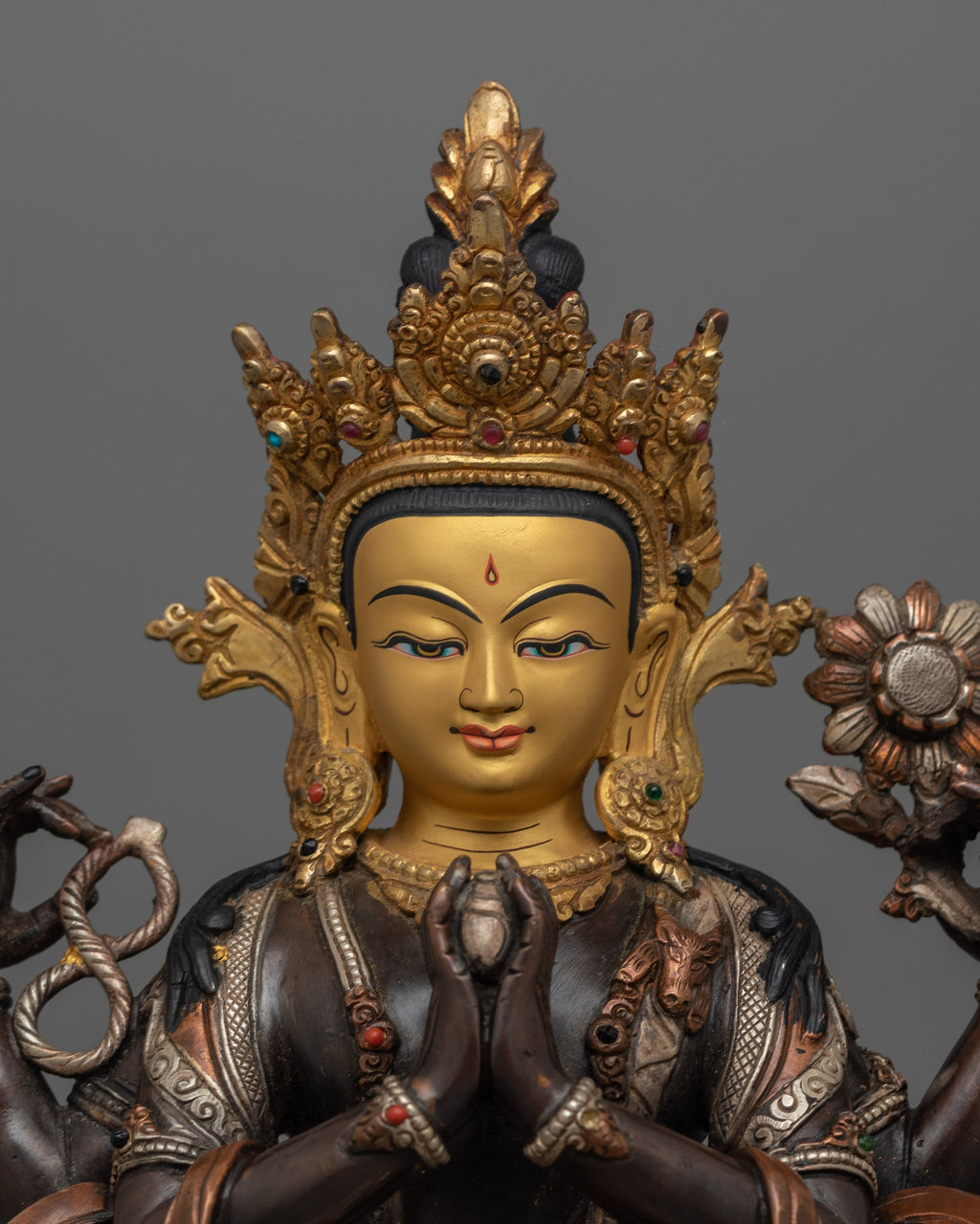 This Meditating Deity Chenrezig Sculpture, known as the embodiment of boundless compassion, represents boundless love, peace, and the desire to alleviate the suffering of all beings. This handcrafted statue is 11.6" (Height) x 8.5" (Base) and weighs 3.72 kg. It is made of oxidized copper, adorned with 24K gold gilding, and enhanced with detailed gold and acrylic paints. This sculpture, created by expert Nepalese artisans, symbolizes the spiritual traditions of Himalayan Buddhism and makes a meaningful addition to altars, meditation places, or sacred collections.