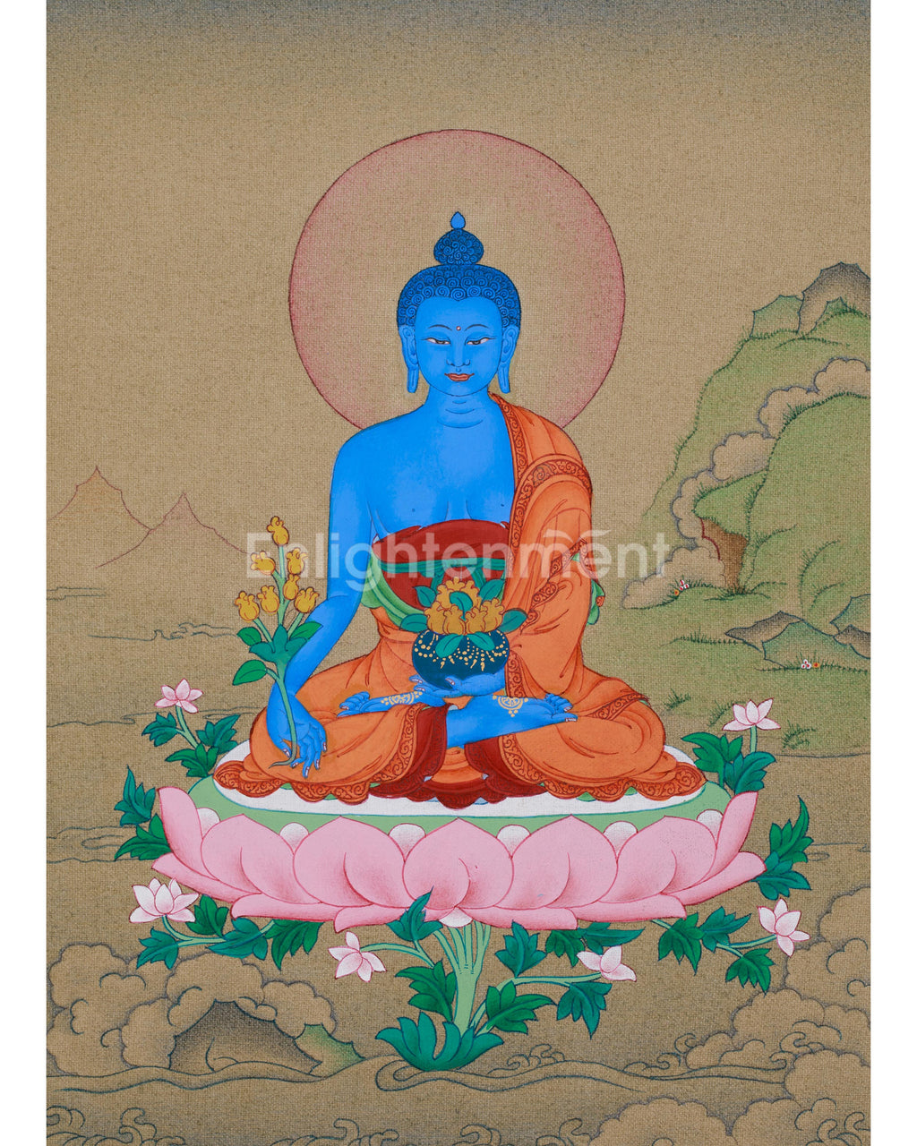 The Medicine Buddha, revered in Buddhist traditions as the healing deity, appears in a calm meditative posture, symbolizing both physical and spiritual healing. He is thought to alleviate suffering and illness, guiding followers toward health and inner harmony. This thangka creates a calming and healing atmosphere, adding a spiritual and visual touch to any space. This thangka depicts his body in the divine shade of Lapis Lazuli, representing wisdom and healing energy. He holds a monk's bowl with Myrobalan fruit, known for its purifying qualities. Sitting on a lotus, which signifies purity and enlightenment, he is backed by a moon disc that symbolizes his divine presence. Overall, this thangka exudes spiritual strength, providing a sense of peace and healing.